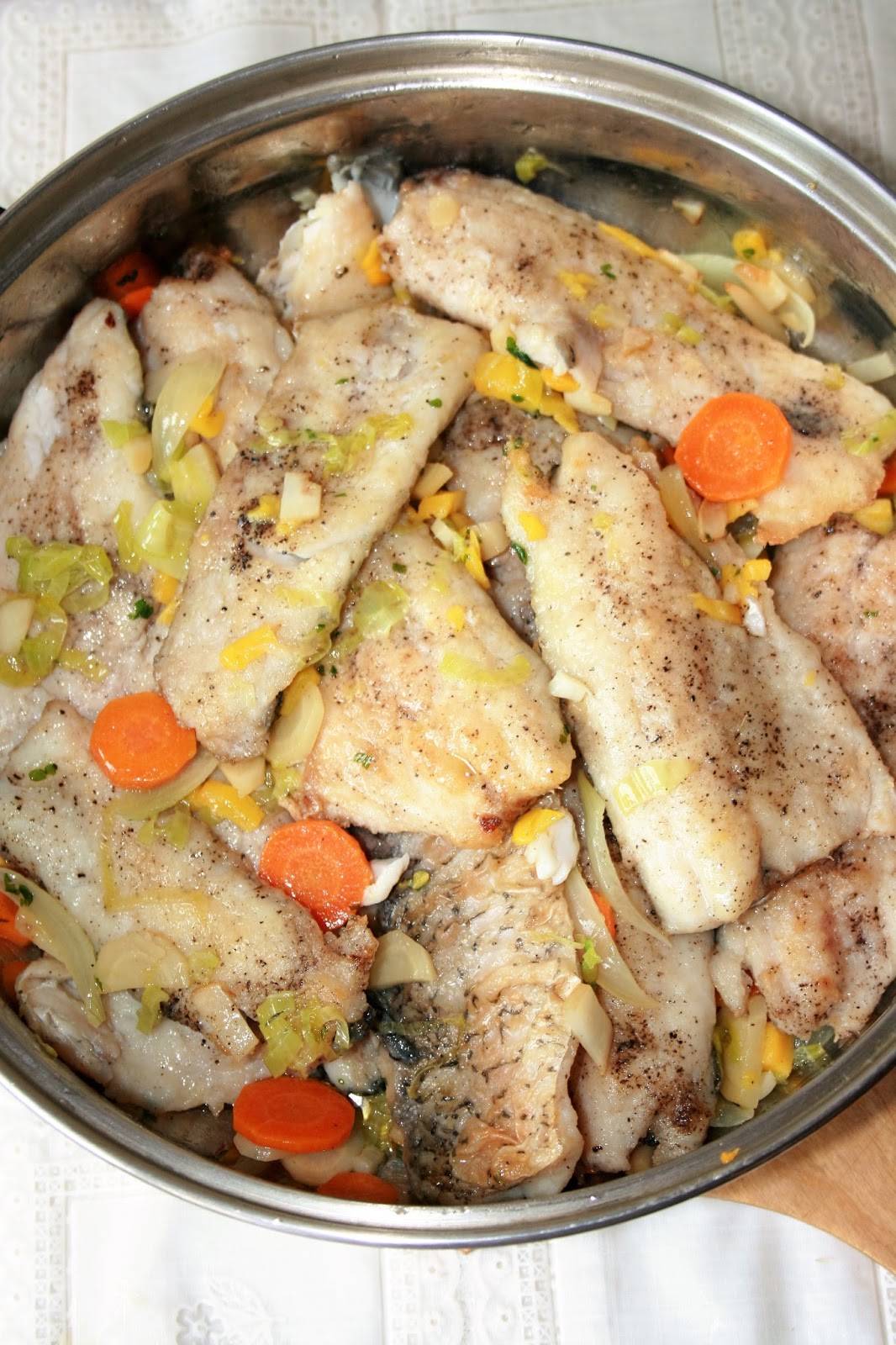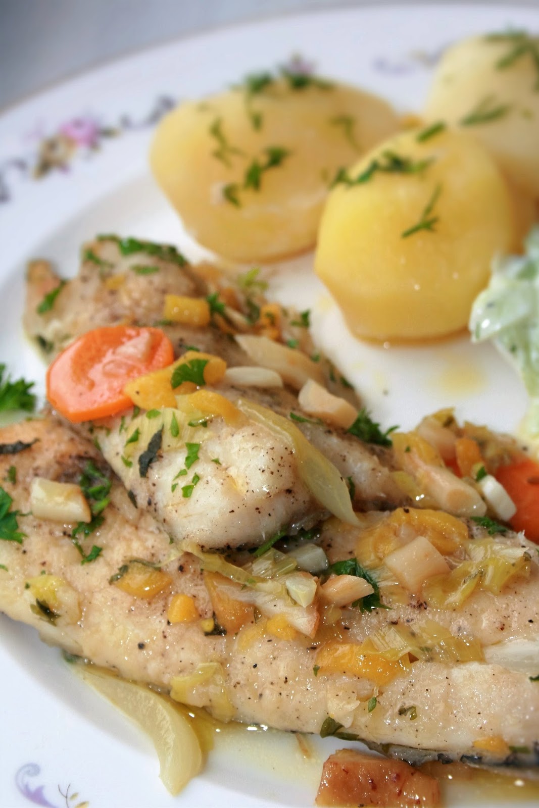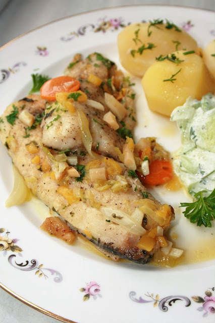 Kto jadł, ten bardzo chwalił dzisiejszy obiad. I rzeczywiście był bardzo dobry. Miałam okazję przygotować świeżą, pyszną rybę (zasługa Taty), a że miałam też dostęp do warzyw prosto z ogródka, to z nimi właśnie ją połączyłam. Filety z klenia, najpierw krótko przesmażone, dusiły się w bardzo aromatycznym sosie z warzyw korzeniowych i ziół, z dodatkiem przyjemnie odświeżającego smak mango. Polecam tę wersję wszystkim, którzy kochają rybę!