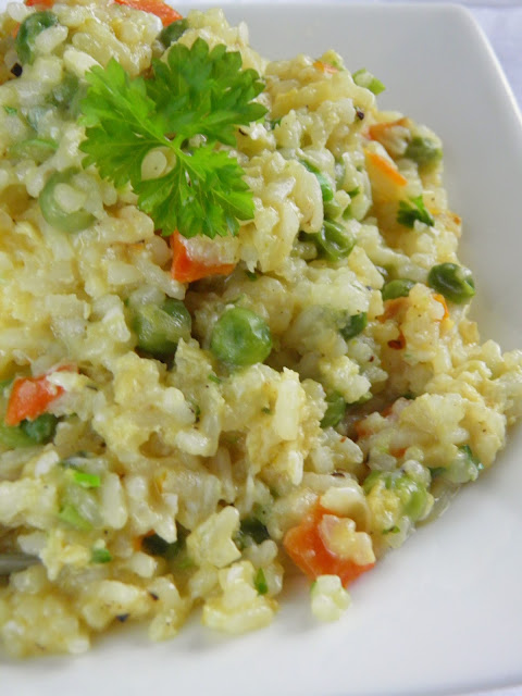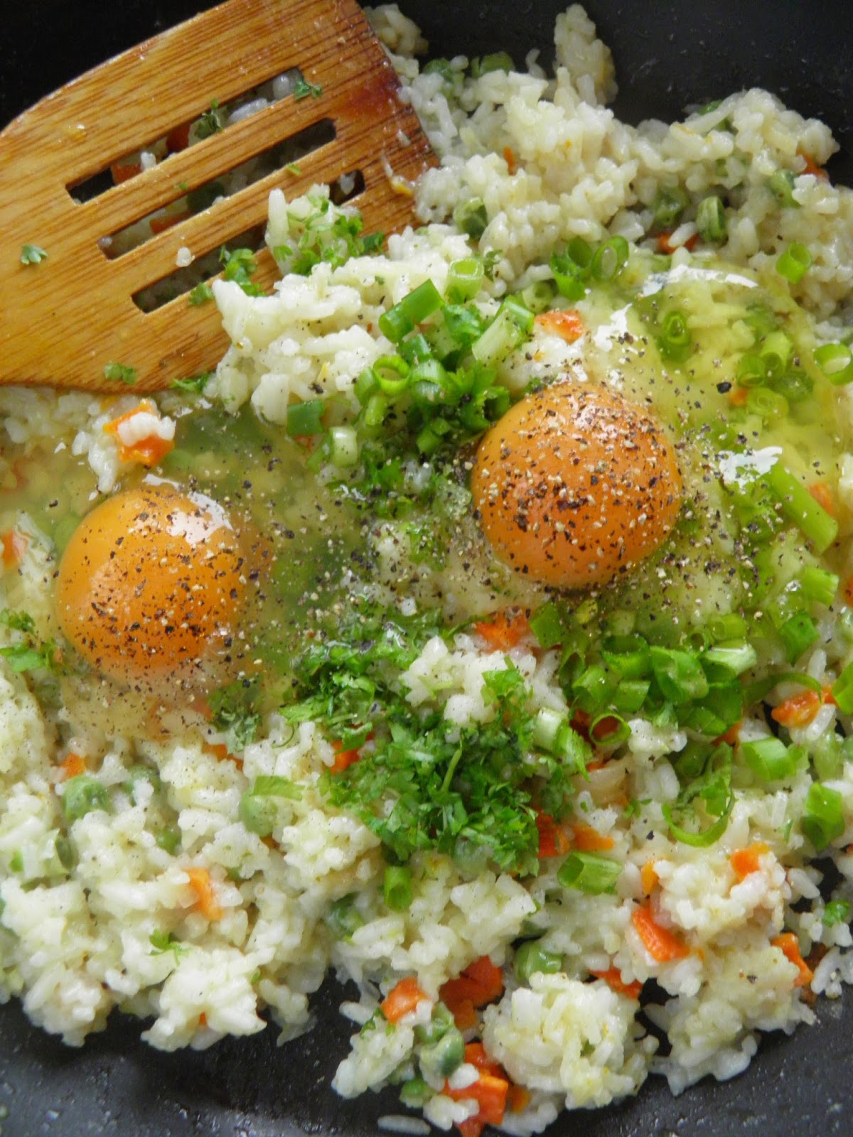 Kto to słyszał, żeby na śniadanie jeść tort czekoladowy?! Ale cóż, zjadłam :) Żeby w ostatecznym rachunku nie było dziś w moim menu za ciężko, na obiad zrobiłam już coś bardzo lekkiego, coś bardzo szybkiego i naprawdę bardzo smacznego: ryż z groszkiem, marchewką i jajkiem, usmażone razem z odrobiną ziół i curry. Nie wiedziałam, że to danie będzie takie pyszne.