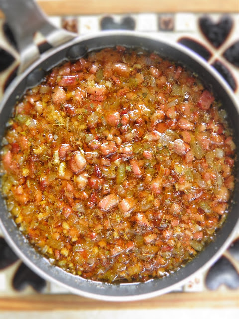 Cieszę się, że moje dzieciństwo przypadło na czasy, zanim usłyszeliśmy o kaloriach, złym glutenie i złych kwasach tłuszczowych, chemii w jedzeniu i wszystkim tym, co jest zmorą dzisiejszej kuchni. Jadło się smacznie, czasem było bardzo skromnie, ale zawsze smakowało. Pamiętacie ziemniaki z czerwonym barszczem? Albo jeszcze lepiej: ze zsiadłym mlekiem, przyniesionym dwa dni wcześniej w kance, od Babci... Może z sentymentu w dalszym ciągu uwielbiam takie jedzenie. Nieodzowna do ziemniaczków była omasta - cudownie pachnące skwareczki przysmażone z cebulką. Nic dziwnego, że była tak pyszna, skoro Mama przygotowywała ją ze świeżutkiego wieprzowego boczku czy podgardla (dodam, że prosiak również był z dobrze znanego babcino-dziadkowego źródła, i że prosiakowi owemu podjadało się ziemniaki gotowane w parniku)Jakie macie sposoby na tę wspaniałą rzecz - omastę, okrasę, tłuszczyk? U mnie musi być dobrej jakości boczek, obowiązkowo cebulka ... i jeszcze co najmniej dwa składniki ;)