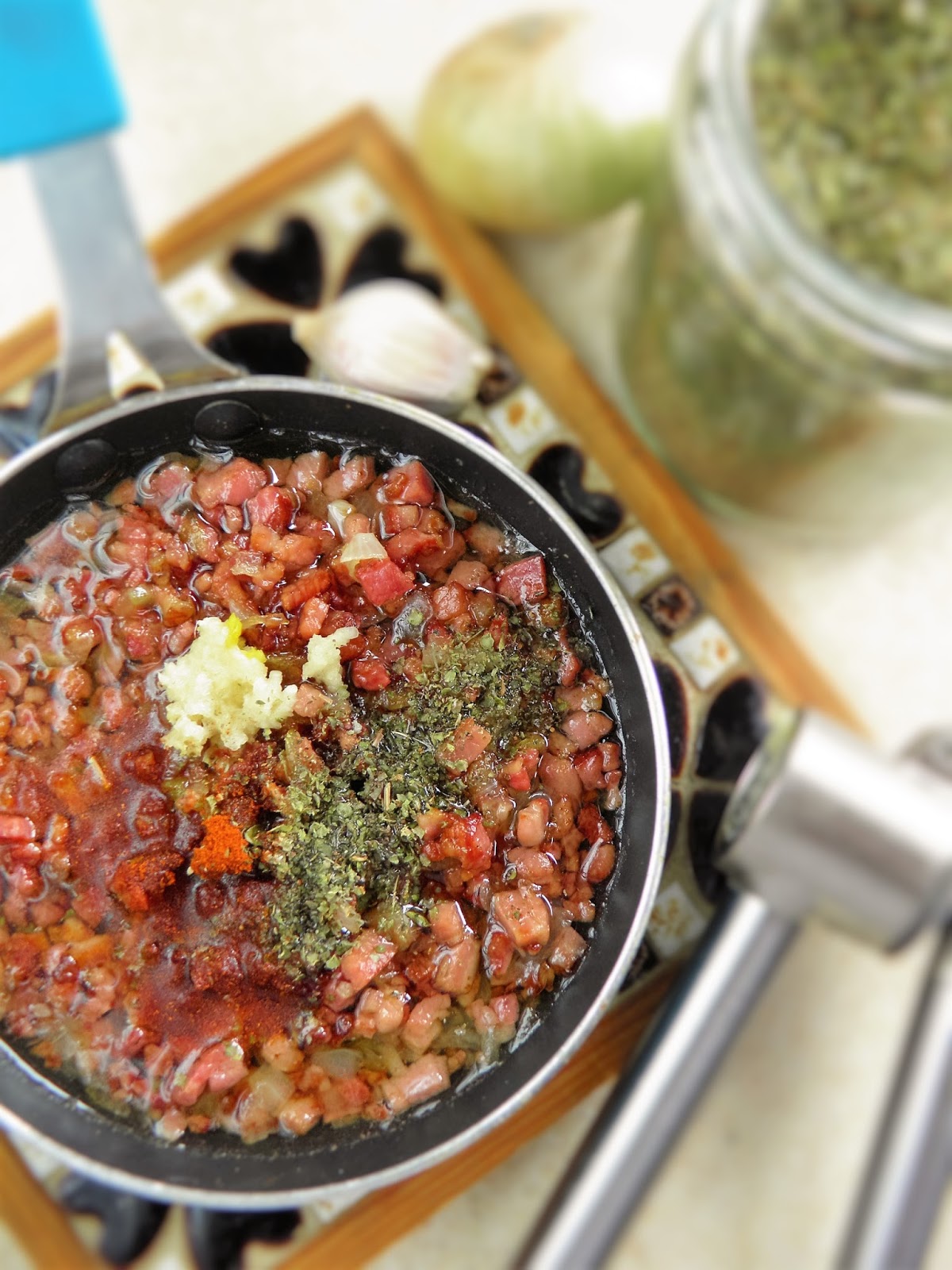Boczek kroję drobniutko, podobnie obrane cebule. Przekładam boczek na patelnię i smażę, aż się wytopi i zarumieni, wtedy dorzucam pokrojoną cebulę. Przykrywam patelnię i smażę razem do zeszklenia cebuli, a potem dodaję przeciśnięty przez praskę czosnek, majeranek i paprykę. Smażę jeszcze chwilę (uwaga, żeby nie przypalić czosnku i papryki, bo wszystko zrobi się gorzkie).