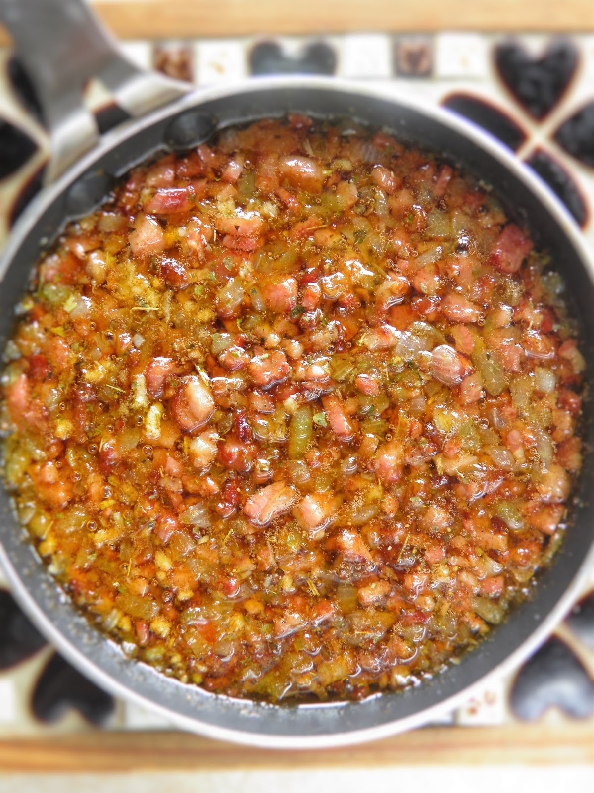 Boczek kroję drobniutko, podobnie obrane cebule. Przekładam boczek na patelnię i smażę, aż się wytopi i zarumieni, wtedy dorzucam pokrojoną cebulę. Przykrywam patelnię i smażę razem do zeszklenia cebuli, a potem dodaję przeciśnięty przez praskę czosnek, majeranek i paprykę. Smażę jeszcze chwilę (uwaga, żeby nie przypalić czosnku i papryki, bo wszystko zrobi się gorzkie).