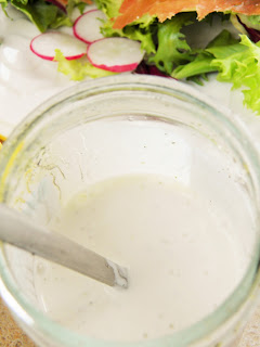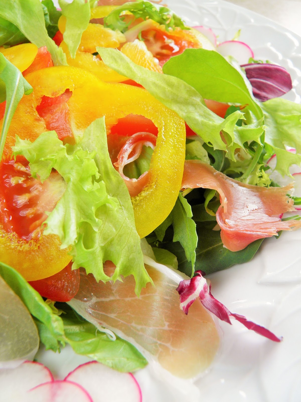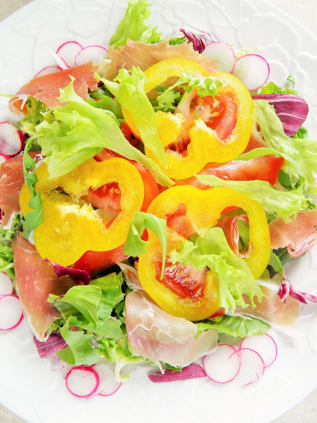 Zaletą sałatki, każdej właściwie, jest fakt że jeśli tylko ma się w domu trochę warzyw, można ją przygotować bardzo szybko. Podstawą zazwyczaj są sałaty, do niech warto dołożyć jakieś soczyste warzywa, a o konkretności takiego posiłku stanowi dodatek mięsa lub sera. No i sos. Zwłaszcza temu warto poświęcić chwilę uwagi, bo w dużej mierze o smaku sałatki decyduje. W mojej dziś jest lekko słodki sos czosnkowy, jednak niezbyt ostry - miał tylko leciutko zaostrzyć smak całości. Aha - i moja rada, którą pewnie wiele osób zna i stosuje - sos najłatwiej wymieszać w zamkniętym słoiku: kilka energicznych ruchów i gotowe.