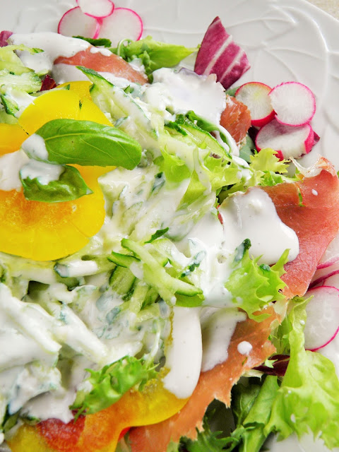 Szynkę rwę na kawałki, paprykę i rzodkiewki kroję w cienkie plasterki, pomidora w ósemki. Ogórki ścieram na grubej tarce. Na talerzach układam solidną porcję sałaty, na nią wykładam kawałki szynki, plastry papryki i rzodkiewki, dokładam cząstki pomidora, porwane listki mięty i bazylii, a na górę wykładam dużą porcję startego ogórka. Obficie polewam sosem i podaję od razu.