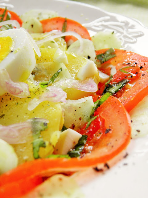 Oczyszczone ziemniaki gotuję w całości w lekko osolonej wodzie, jajka gotuję na twardo. Jeszcze ciepłe ziemniaki i jajka kroję w plastry. Pomidory kroję w bardzo cienkie plastry, podobnie ogórka i szalotki. Siekam drobno bazylię. Układam wszystkie warzywa i jajka na talerzu. Wszystkie składniki sosu mieszam dokładnie (najłatwiej zrobić to w zamkniętym słoiku), polewam sosem sałatkę. Całość oprószam pieprzem.