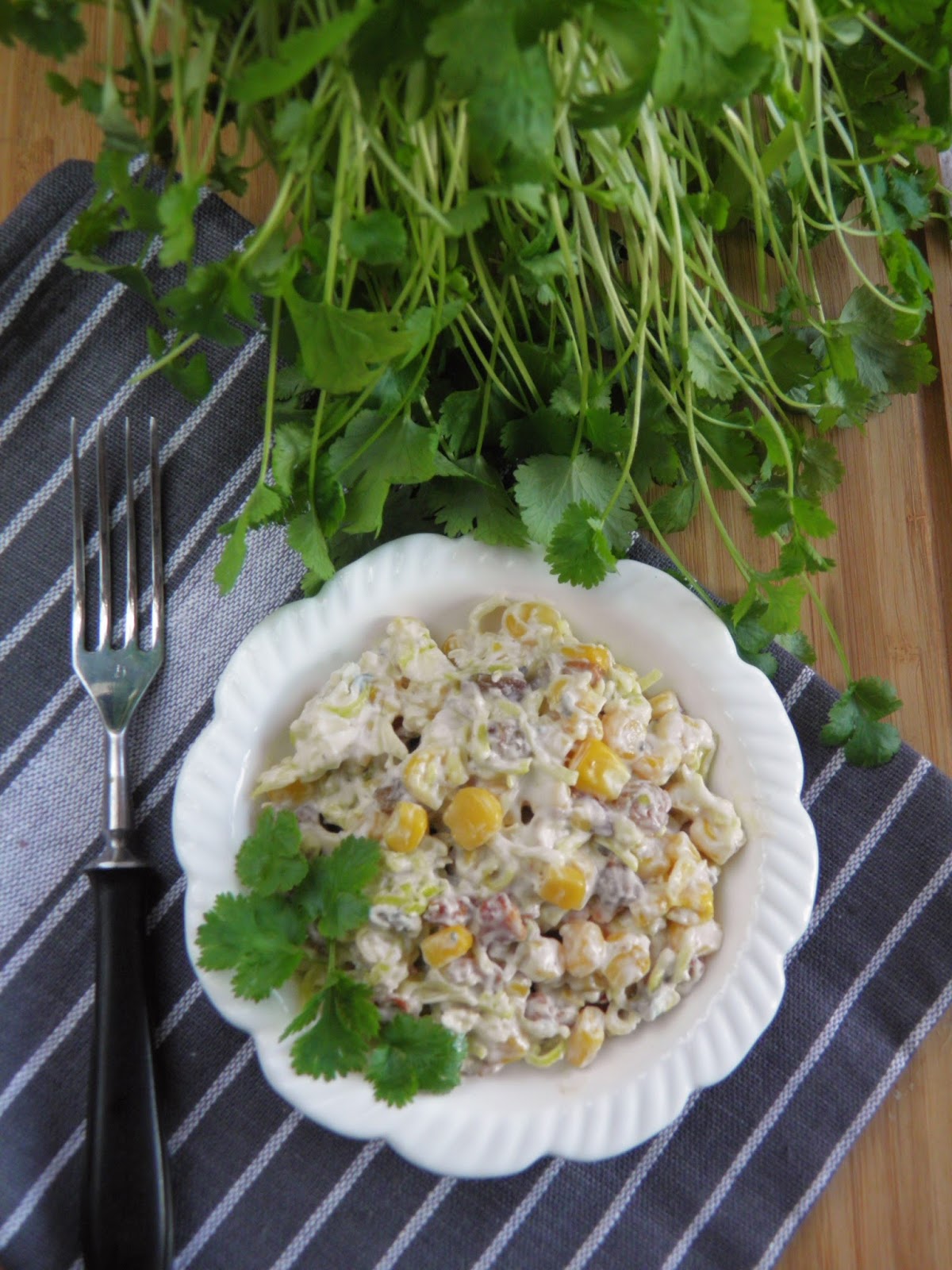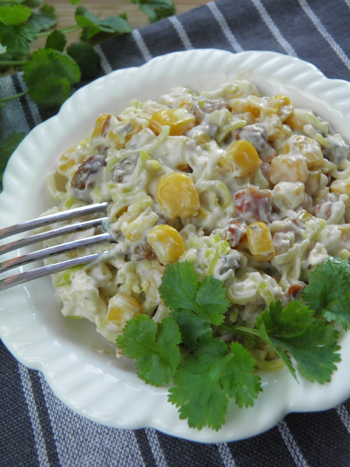 Sałatka z kukurydzą, rodzynkami i boczkiem
