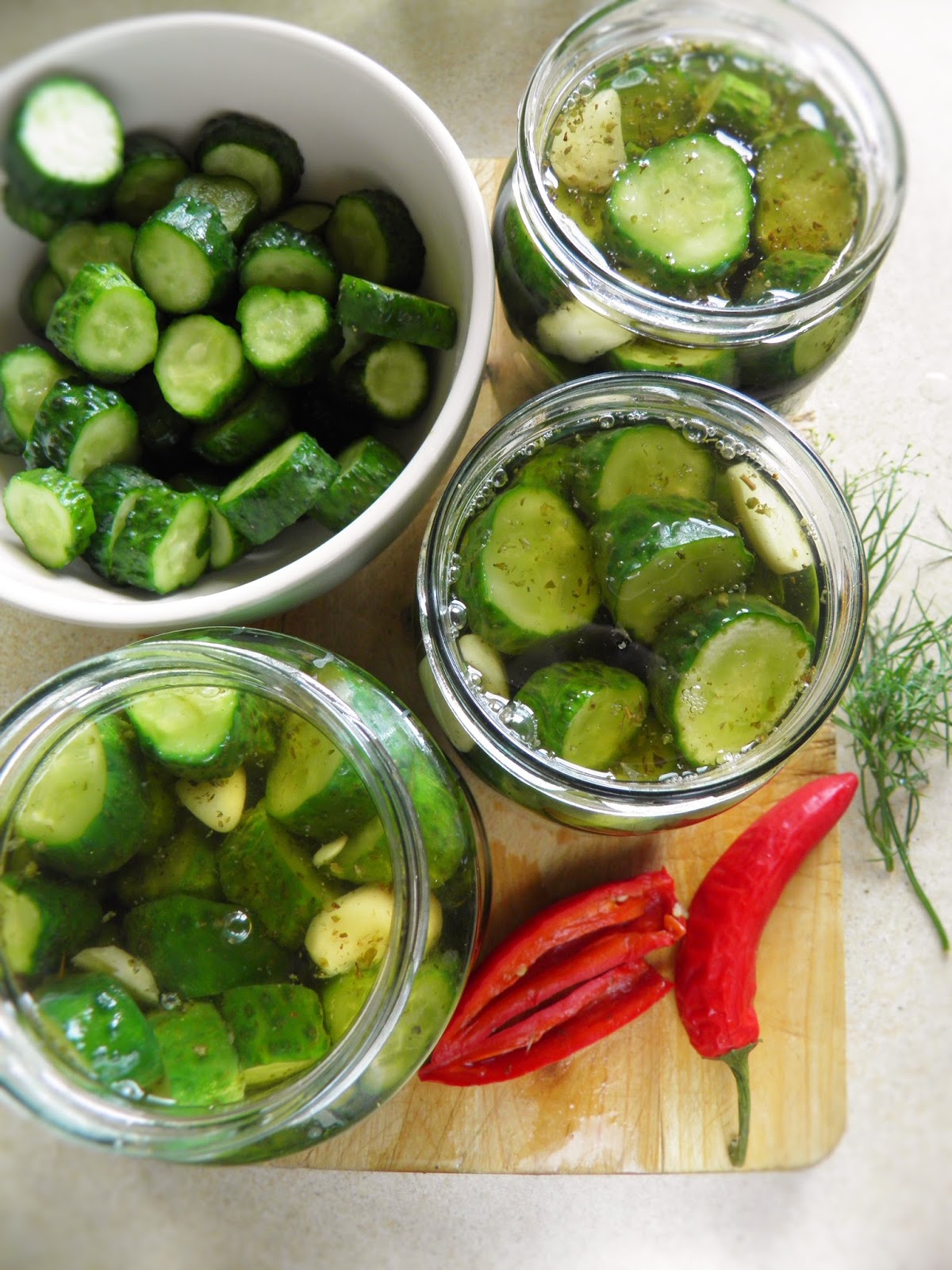 Dokładnie myję ogórki, po czym kroję je w grube plasterki ( ok. 1 cm) i przekładam do miski. Posypuję je solą, mieszam i odstawiam na 3 godziny (w międzyczasie mieszam). Następnie przekładam ogórki na sito i płuczę z soli. Na dno wyparzonych słoików (wyszły 4 po 400 g) wkładam po gałązce koperku, potem wypełniam słoik ogórkami, wciskam też po 1 przekrojonym ząbku czosnku. Przygotowuję zalewę: wodę zagotowuję z lubczykiem, solą, cukrem, papryczką i przyprawami, gotuję pod przykryciem 10 minut. Wart sprawdzić po kilku minutach, czy nie trzeba już wyjąć papryczki - w zależności od tego, jak pikantny lubimy smak. Gorącą zalewą wypełniam słoiki, mocno zakręcam, następnie pasteryzuję 10 minut. Odstawiam do góry dnem do wystygnięcia.