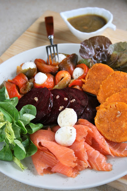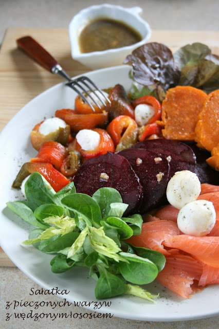 Sałatka z pieczonych warzyw z wędzonym łososiem