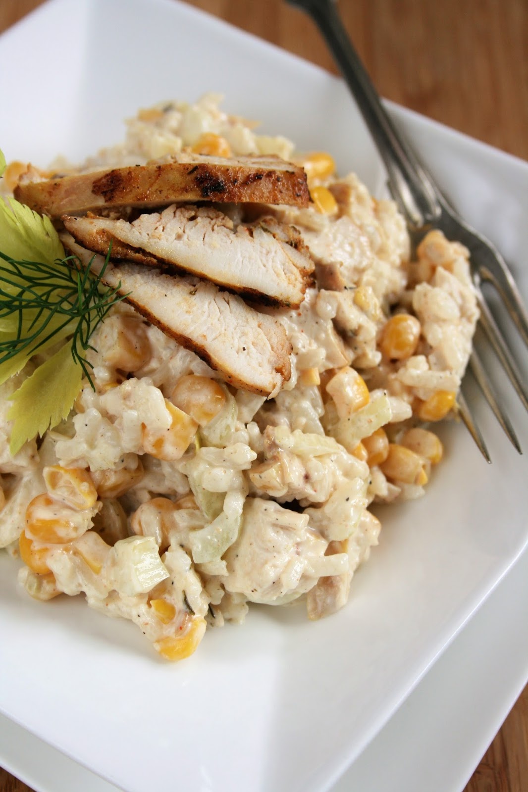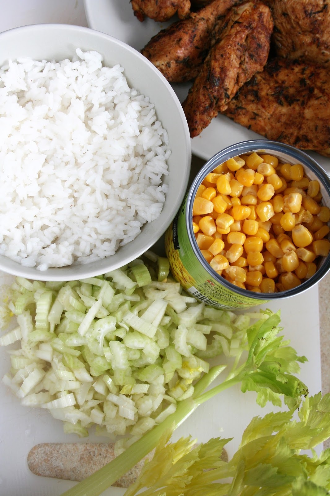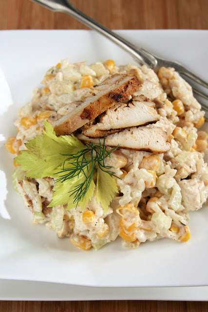 Bardzo smaczna i sycąca sałatka z kurczakiem, słodką kukurydzą, selerem naciowym i ryżem.
