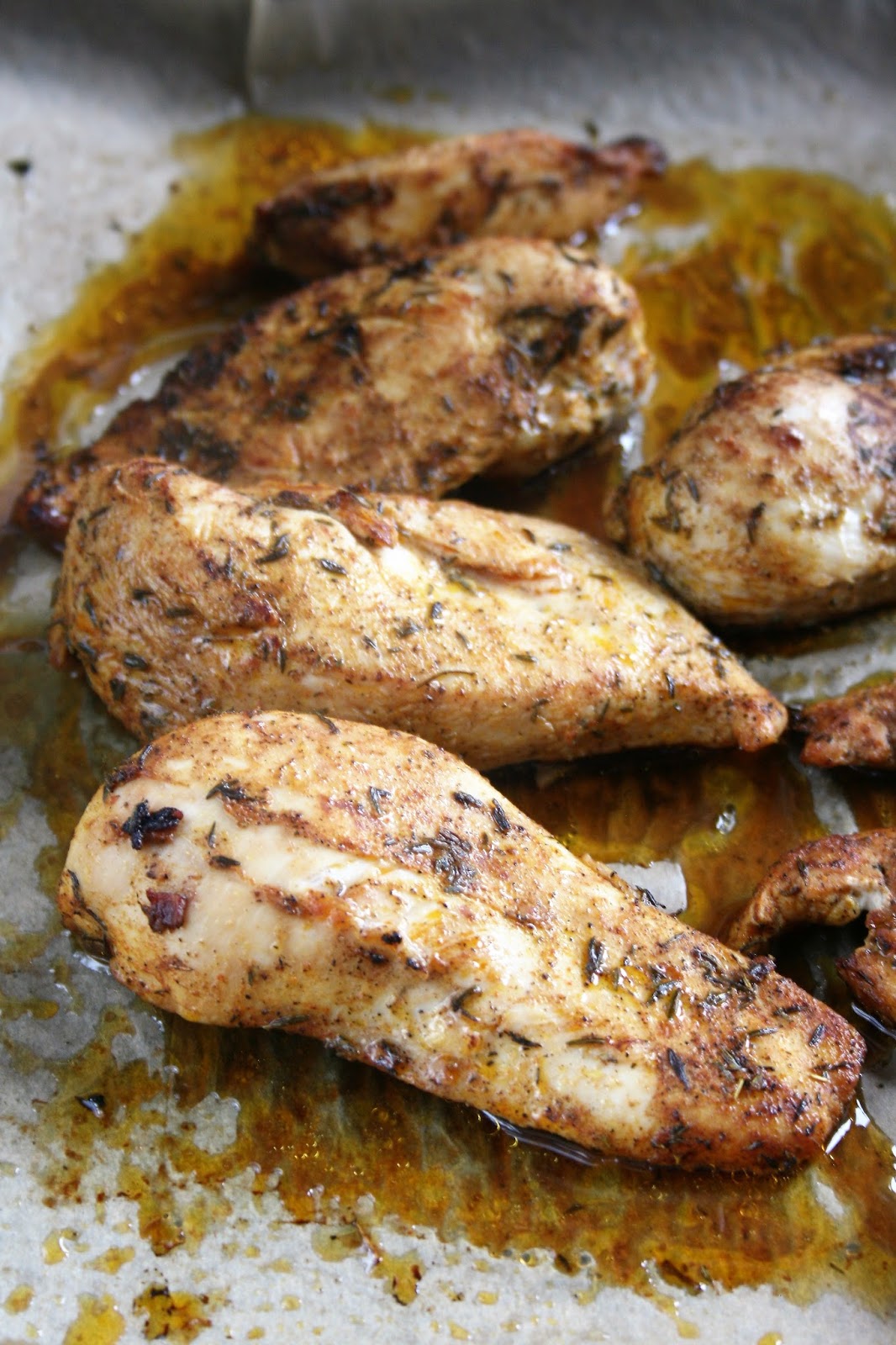 Ze składników marynaty mieszam pastę, nacieram nią kurczaka i odstawiam mięso na 2 godziny do lodówki. Następnie szybko obsmażam mięso z obu stron i przekładam na lekko natłuszczony papier na blasze - piekę kurczaka 25 minut w temperaturze 175 stopni C (pod przykryciem z folii aluminiowej). Upieczone mięso przekładam na talerz do wystygnięcia, a potem kroję je w kostkę.