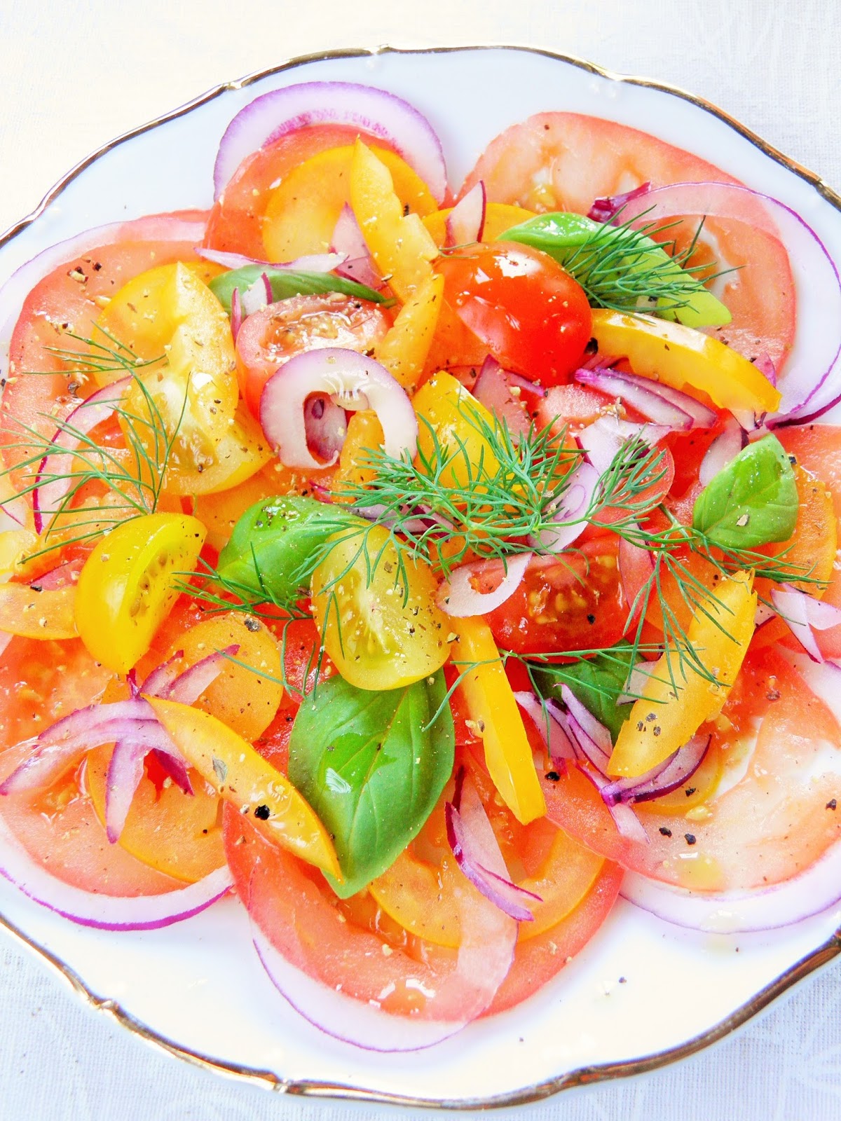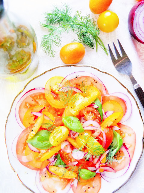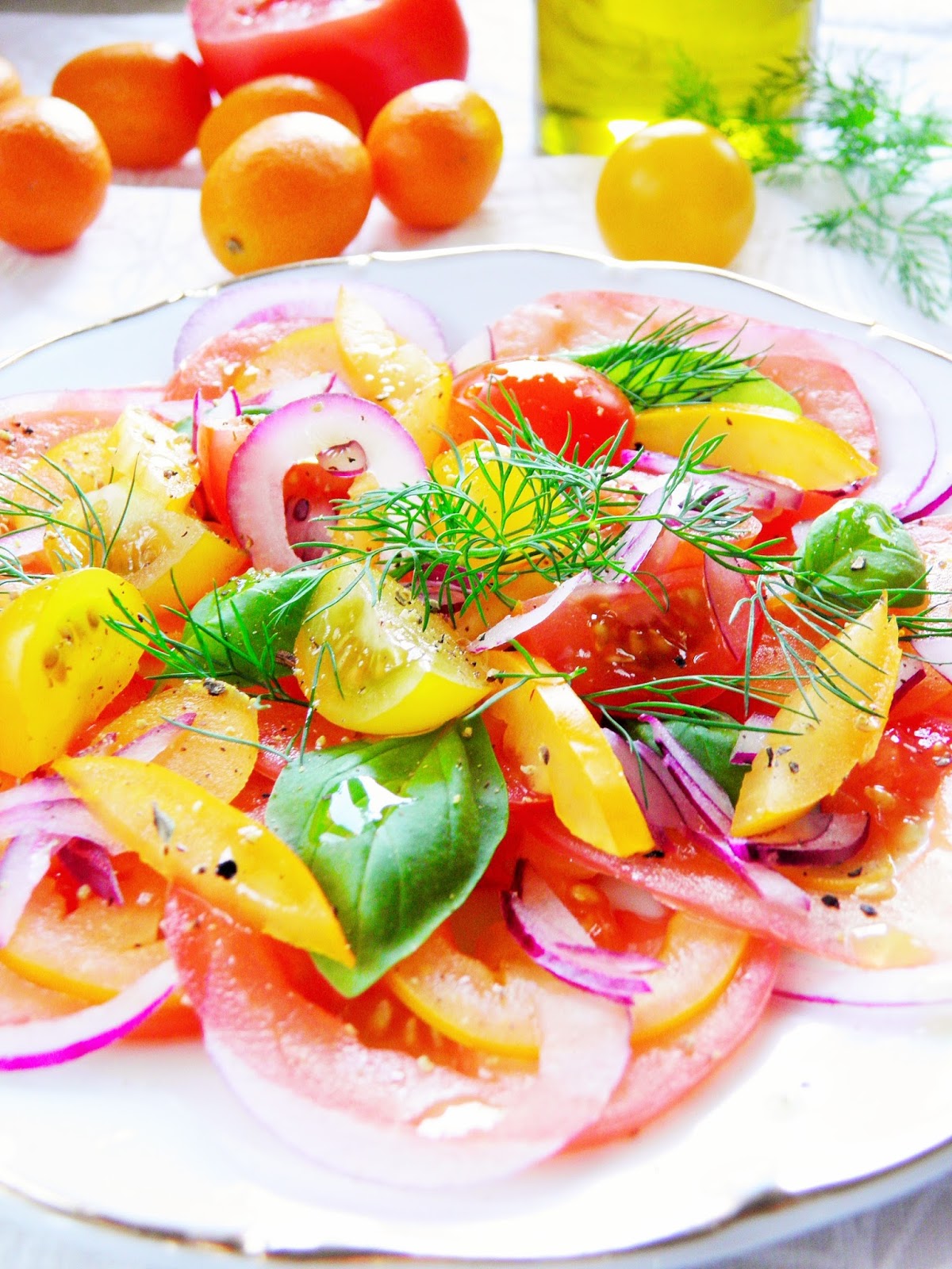 Sałatka z pomidorów i czerwonej cebuli z koperkiem i oliwą