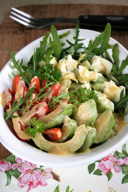 Sałatka z rukolą, awokado i jajkiem z sosem jogurtowo-słonecznikowym