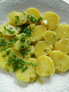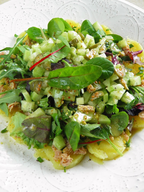 Sałatkę polecam na obiad zwłaszcza dla osób dbających o linię, bo choć sycąca i pełna smaku, to jest lekkim posiłkiem. Przygotowałam ją z gorących ziemniaków - warto zadbać, by takie właśnie były pomimo ceny poparzonych paluchów - bo gdy polejemy je sosem, ten doskonale się z nimi łączy.