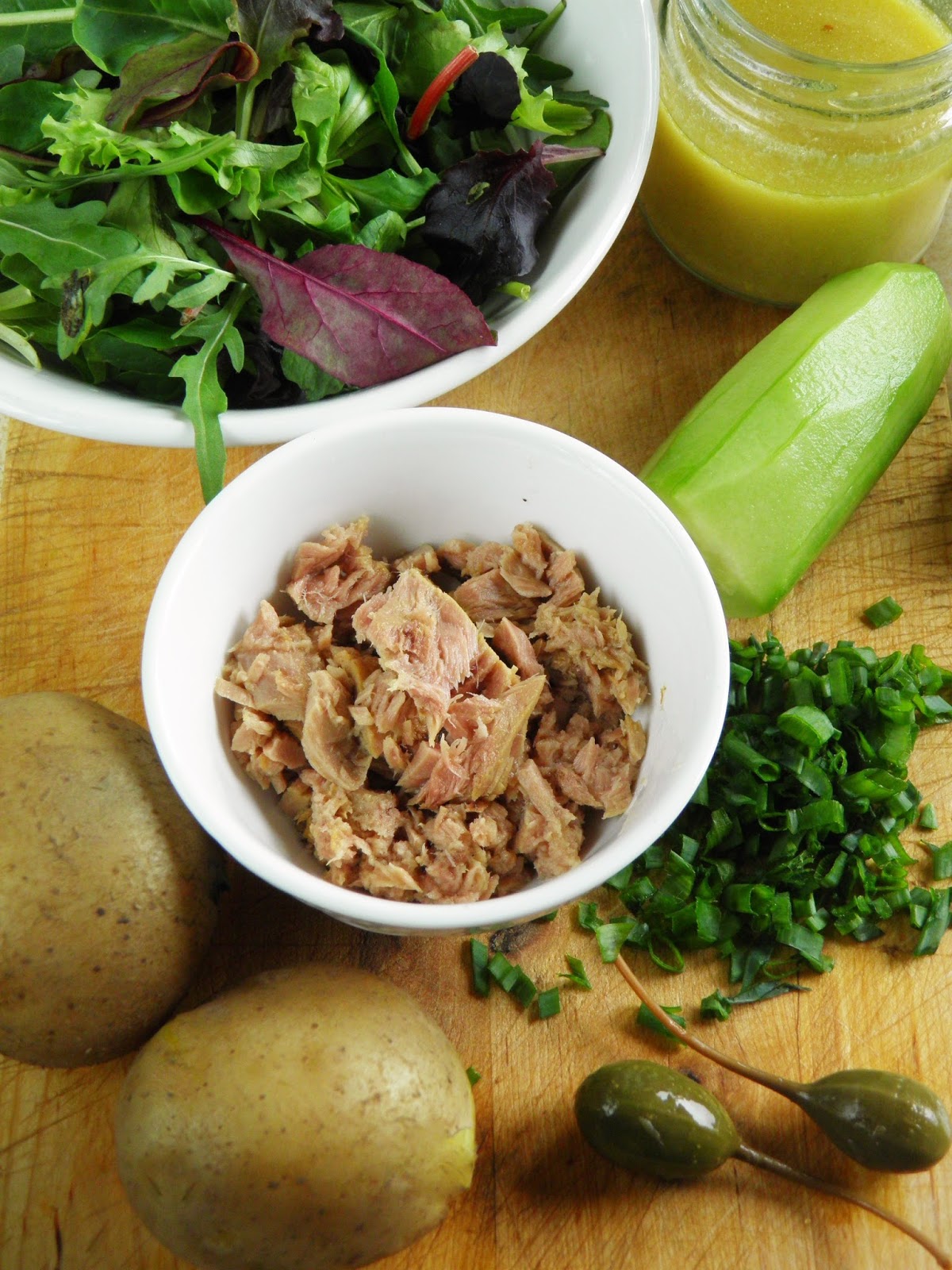 Ziemniaki szoruję szczoteczką i gotuję w mundurkach do miękkości. Gorące obieram i kroję w plastry grubości ok. 0,5 cm. Plastry ziemniaków polecam delikatnie sosem i posypuję posiekanym szczypiorkiem. Na szczypiorek wykładam kawałki tuńczyka (wcześniej odsączone), posypuję porwaną na kawałki sałatą. Na górę sałatki wykładam posiekane kapary i ogórka pokrojonego w drobną kostkę. Całość polewam pozostałym sosem i od razu podaję.