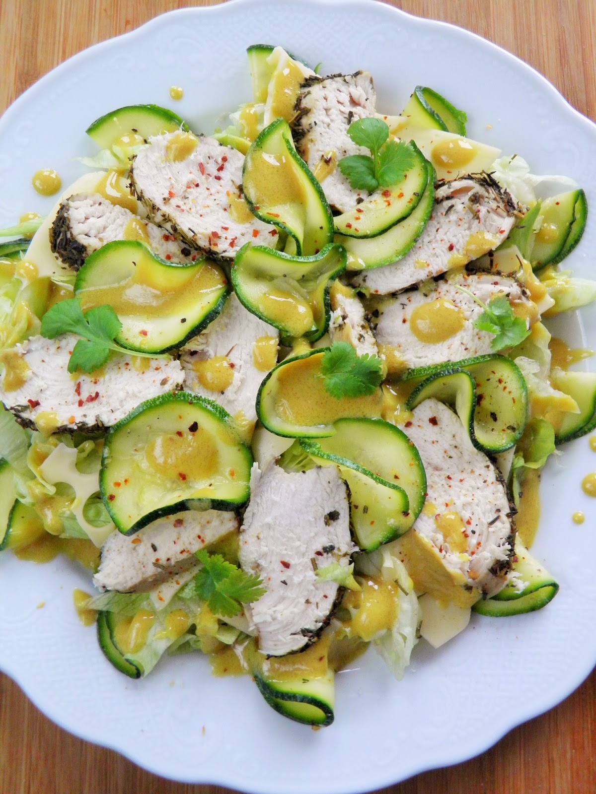Dietetyczna sałatka z pieczonym kurczakiem i marynowaną cukinią