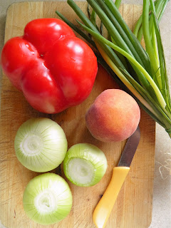 Mięso kroję na duże kawałki, układam na talerzu, oprószam sola, pieprzem i słodką papryką, a potem mąką. Smażę mięso w 2 partiach na dość rozgrzanym tłuszczu - ma się ładnie zarumienić. Zdejmuję mięso z patelni i wrzucam na pozostały po nim tłuszcz pokrojone w duże kawałki cebule. Lekko je solę, przykrywam i smażę 3-4 minuty, po czym dorzucam pokrojoną w mniej więcej tej samej wielkości kawałki paprykę. Smażę kolejne kilka minut - dalej pod przykryciem, po czym dorzucam połowę posiekanego szczypiorku i brzoskwinie w kawałkach (bez skórki). W międzyczasie w połowie porcji wody rozpuszczam cukier, dodaję przecier pomidorowy, sos sojowy, mąkę ryżową i przeciśnięty przez praskę czosnek. Gdy zawiesina jest porządnie rozmieszana wlewam ją na patelnię i od razu mieszam całą zawartość, dolewam też stopniowo pozostałą wodę. Na koniec doprawiam sos do smaku solą i pieprzem.