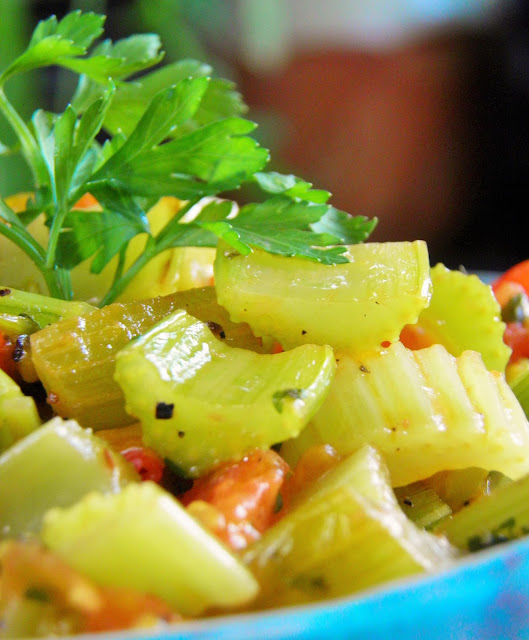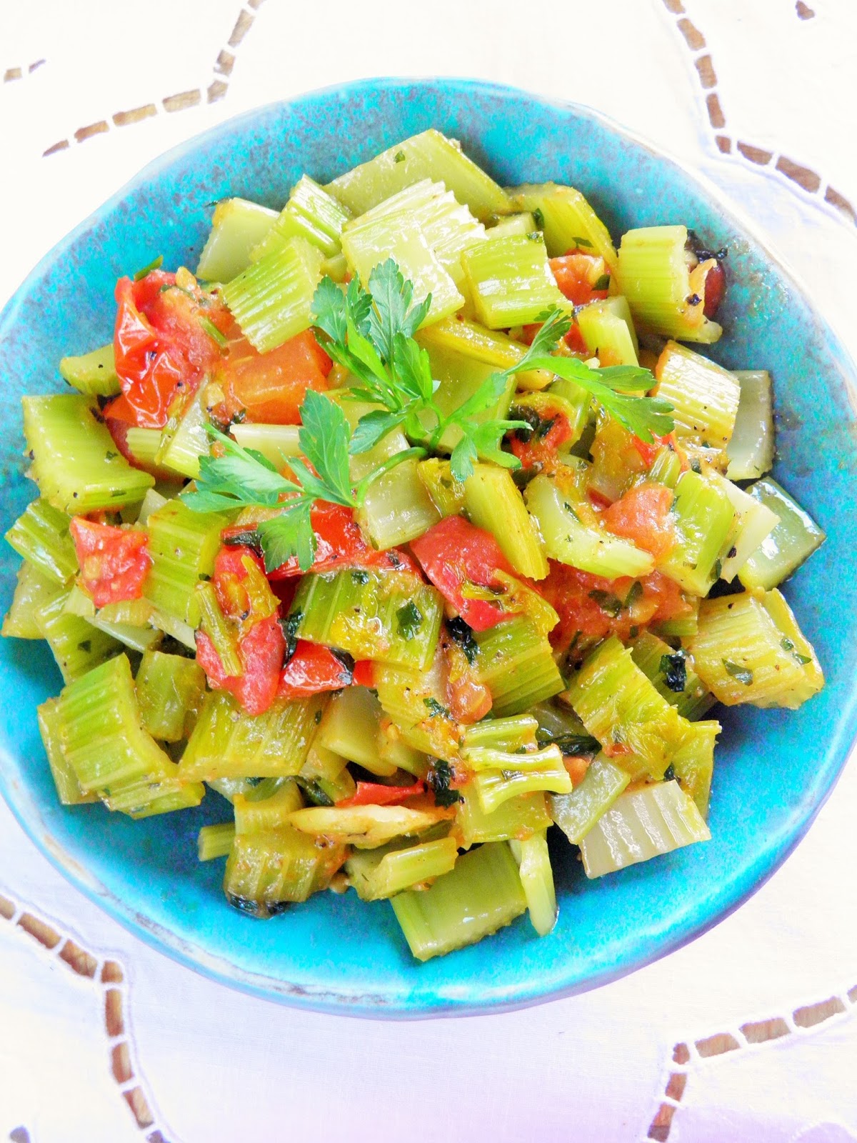 Umyte łodygi selera (bez natki) kroję w cienkie plasterki i przekładam na patelnię z rozpuszczonym masłem. Lekko go solę i pod przykryciem, mieszając od czasu do czasu, smażę 7-8 minut. Pomidora kroję w kostkę (można go wcześniej obrać ze skórki) i dodaję do selera, dodaję także posiekaną natkę pietruszki. Łącznie duszę warzywa ok. 25 minut, na koniec doprawiam solą i pieprzem.