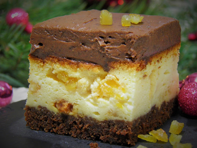 Sernik z brzoskwiniami i skórką pomarańczową na czekoladowym cieście