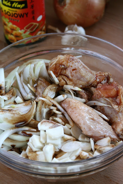 Składniki:8 skrzydełek z kurczaka1 spora cebula3 ząbki czosnku2 średniej wielkości pietruszki1 niewielka cykoria (może być kawałek kapusty pekińskiej)3 łyżki jasnego sosu sojowego100 g. pędów bambusa (paseczki)2 łyżki oleju1 szklanka bulionu drobiowego1 płaska łyżeczka mąki ziemniaczanej1 pełna łyżeczka słodkiej mielonej paprykisól i pieprz do smakuPrzygotowanie:Skrzydełka ostrym nożem dzielę na dwie części, odrzucając końcówki (przydadzą się do zupy), przekładam je do miski. Obraną cebulę siekam w piórka, pietruszkę w cienkie plasterki, siekam też czosnek - wszystkie warzywa dokładam do kurczaka. Polewam wszystko sosem sojowym, posypuję słodką papryką i mieszam, a następnie wykładam na głęboką patelnię ze średnio rozgrzanym olejem. Przykrywam i smażę 6-8 minut, mieszając. Następnie dorzucam grubo pokrojoną cykorię, ponownie przykrywam i duszę razem ok. 30 minut. Wlewam bulion (zostawiam 3 łyżki), doprawiam wstępnie całość do smaku solą i pieprzem, duszę 5 minut. Pozostawiony bulion mieszam dokładnie z mąką ziemniaczaną, po czym mieszaninę wlewam na patelnię i dokładnie mieszam do zgęstnienia. Dorzucam paseczki bambusa, duszę jeszcze 5 minut. Podaję z ryżem lub z surówką.