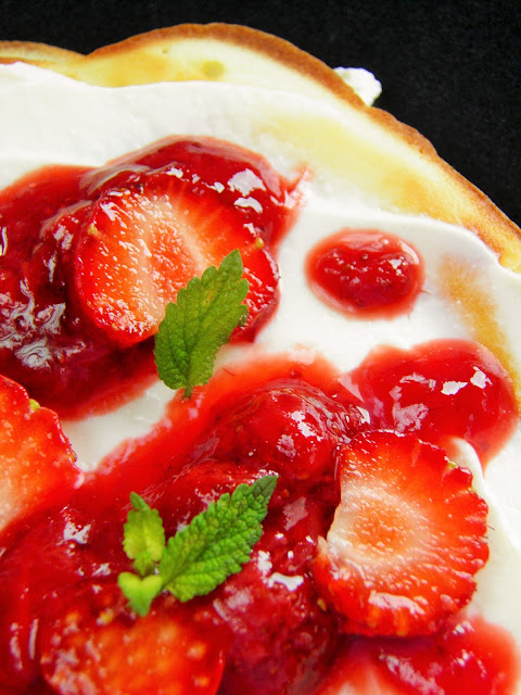 pysznym deserem, jak również śniadaniem czy obiadem. Różnią się smakiem od tradycyjnych, są trochę trudniejsze w smażeniu, ale na pewno są warte trochę większego wysiłku. Dodatki to aksamitny serek, niezbyt słodki dżem truskawkowy moje własnej produkcji i świeże truskawki.