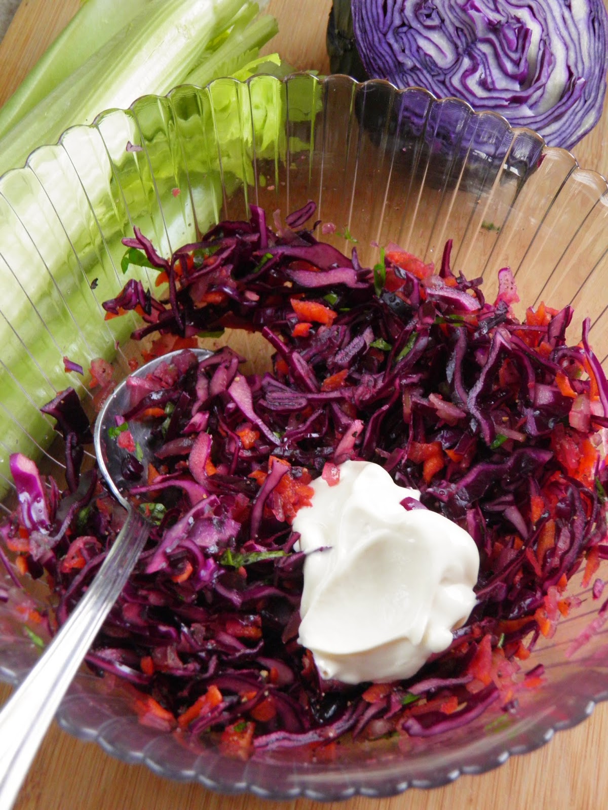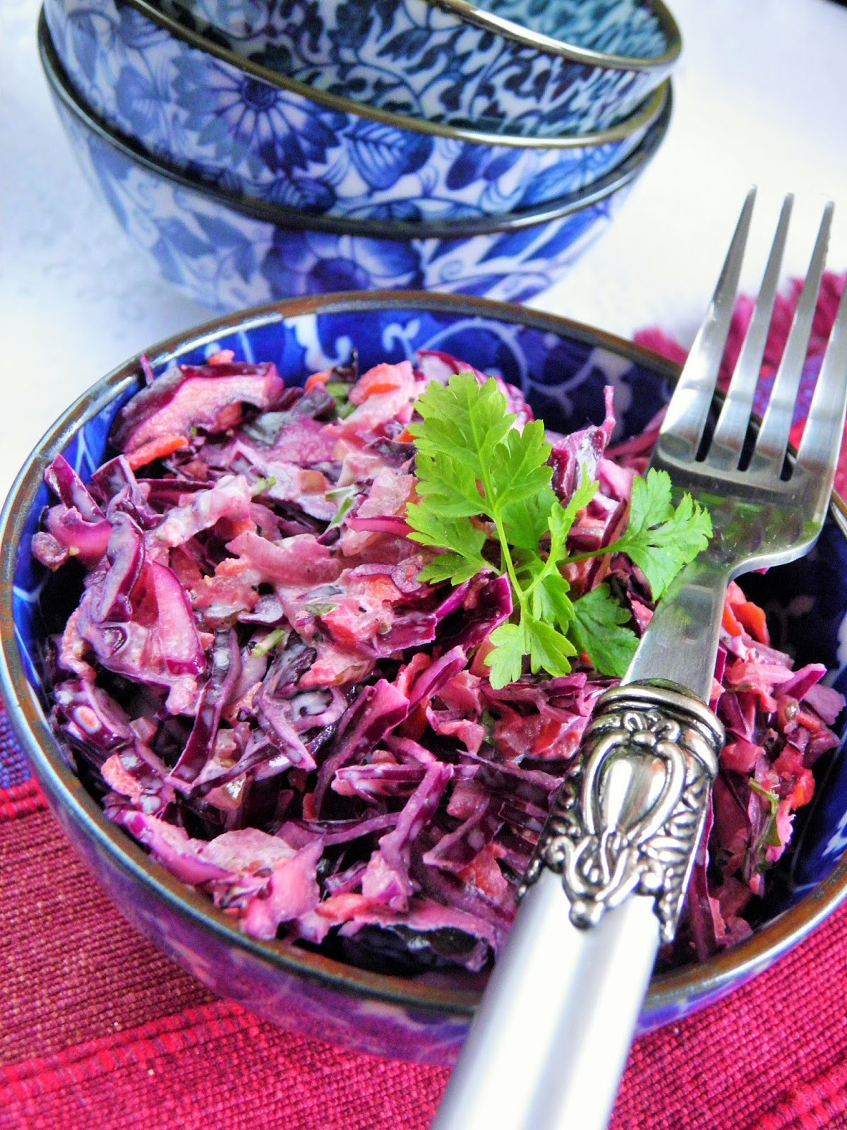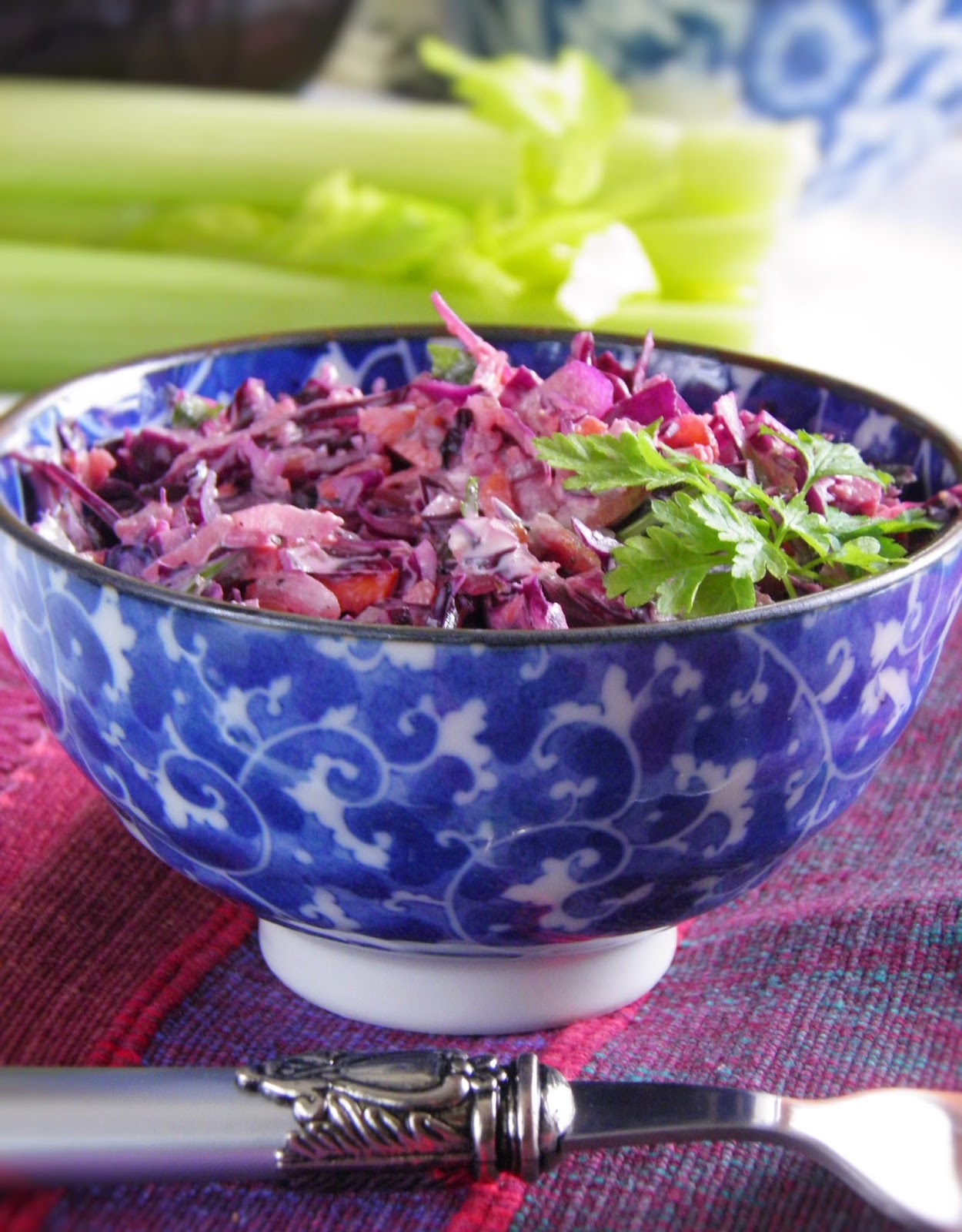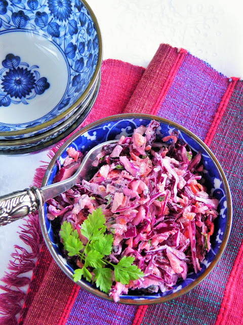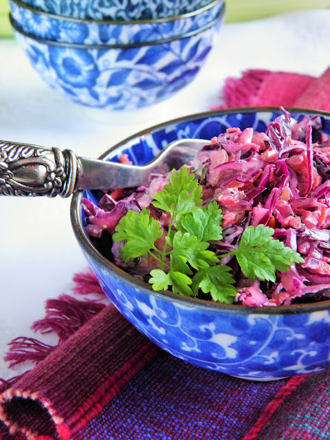 Bardzo lubię surówki z czerwoną kapustą. Dziś połączyłam ją z wyrazistym w smaku selerem naciowym, do tego jeszcze słodka marchewka i natka pietruszki. Odrobina majonezu, przyprawy - jest pyszna!