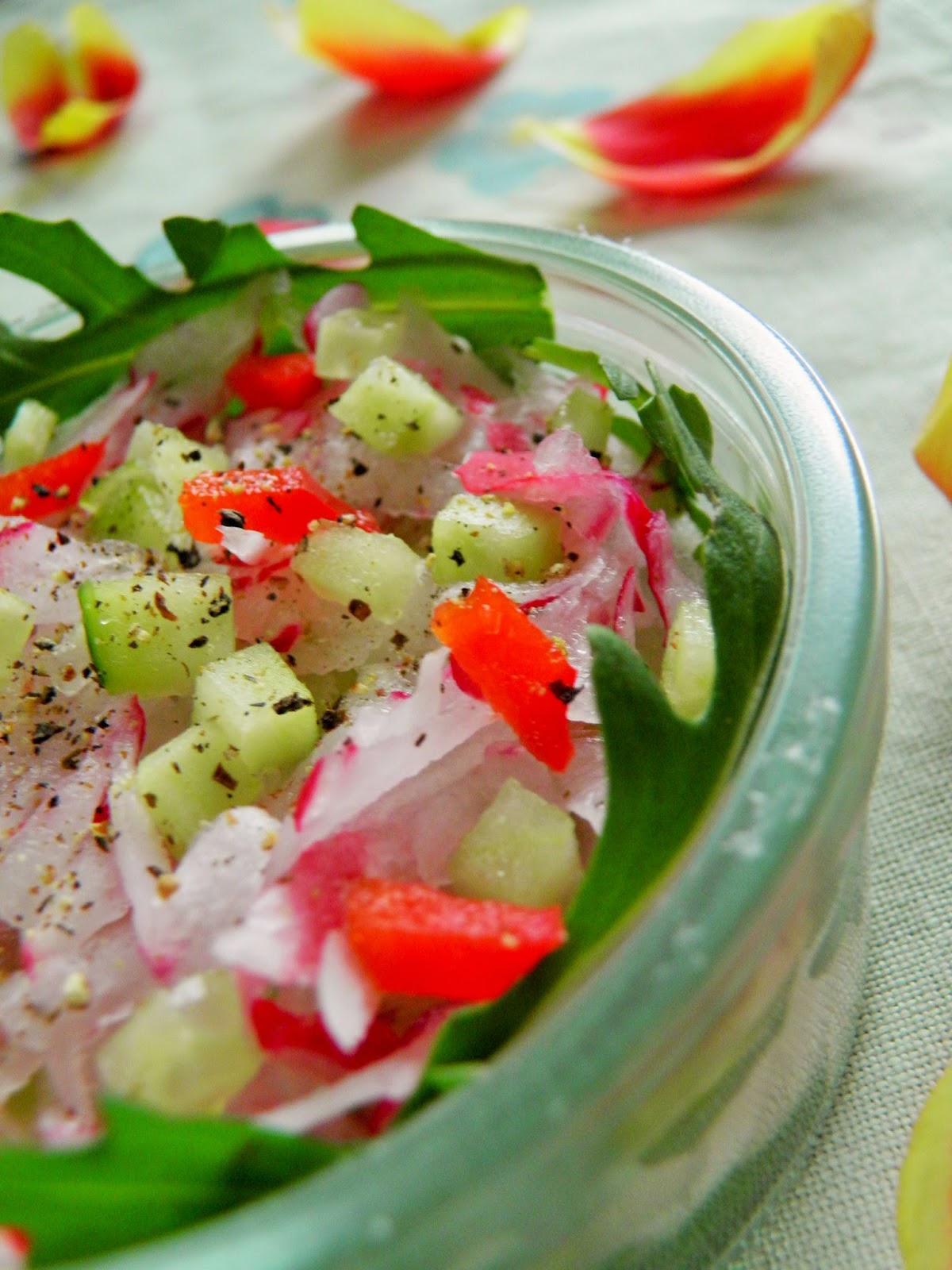 Wszystkie warzywa dokładnie myję. Rzodkiew obieram i ścieram na tarce z grubymi oczkami, podobnie robię z rzodkiewką. Szklaną (przezroczystą) miseczkę wykładam listkami rukoli, także z boków, by były widoczne, a następnie układam warstwy: startej białej rzodkwi, cienko pokrojonego ogórka i startej rzodkiewki. Powierzchnię surówki posypuję drobnymi kosteczkami papryki i ogórka, oprószam solą i pieprzem. Można dodać jogurt.