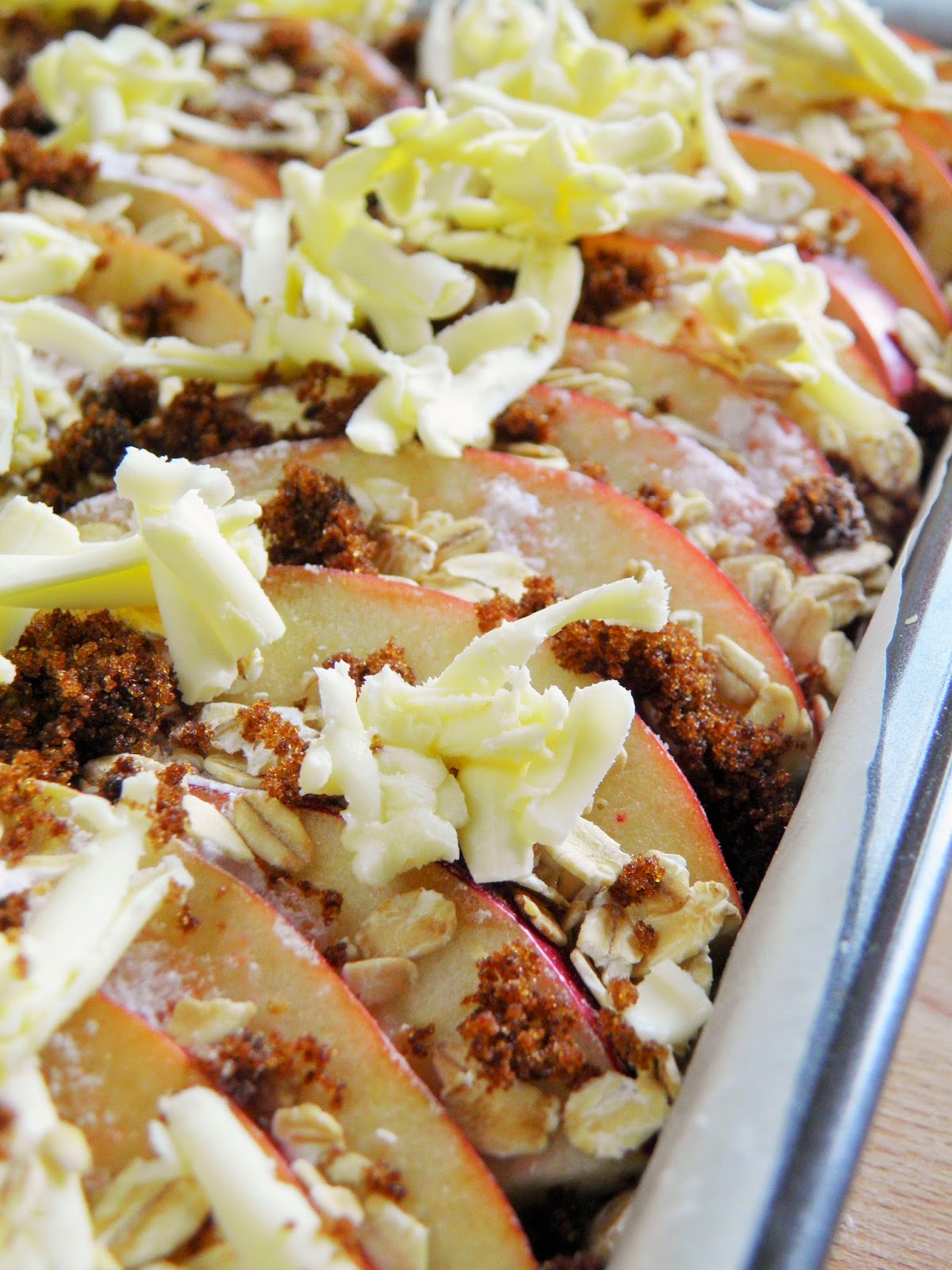 Ta szarlotka nie wymaga zbyt wielkiej uwagi, ot - trzeba połączyć składniki w całość, pokroić jabłka i prawie gotowe. Rolę kruszonki spełniają tu płatki żytnie, pomieszane z ciemnym cukrem i masłem. To szybkie i łatwe ciasto.