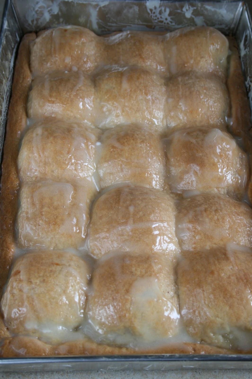 Mąkę, cukier puder i waniliowy, proszek do pieczenia oraz śmietanę przekładam do miski, dodaję drobno posiekane masło i zagniatam jednolite, elastyczne ciasto. Dzielę ciasto na dwie części (jedna odrobinę większa - pójdzie na górę). Mniejszą rozwałkowuję na wielkość dnia blachy, przekładam za pomocą wałka (blacha wcześniej natłuszczona masłem). Ciasto oprószam bułką tartą i układam na nim połówki obranych jabłek (wycinam gniazda nasienne). Jabłka oprószam cukrem i cynamonem, po czym przykrywam drugim rozwałkowanym plackiem (ten trzeba rozwałkować na większy, by pokrył jabłka). Jeśli zostaje trochę ciasta, formuję z niego wałeczki i wklejam je po bokach. Tak przygotowane ciasto wstawiam do piekarnika nagrzanego do 180 stopni C (góra-dół, środkowy poziom piekarnika, bez termoobiegu) na ok. 50 minut - powinno być ładnie zarumienione. Gorące ciasto smaruję śmietaną dokładnie wymieszaną z pudrem (najłatwiej to zrobić pędzelkiem) i wstawiam jeszcze na 5 minut, by lukier się ładnie podpiekł. Po całkowitym wystygnięciu kroję ciasto tak, by każda połówka jabłka stanowiła jeden kawałek.