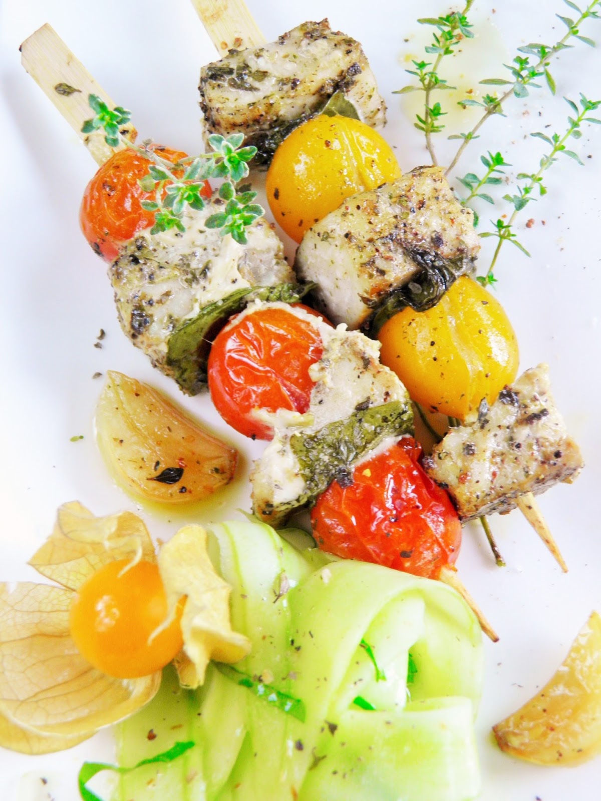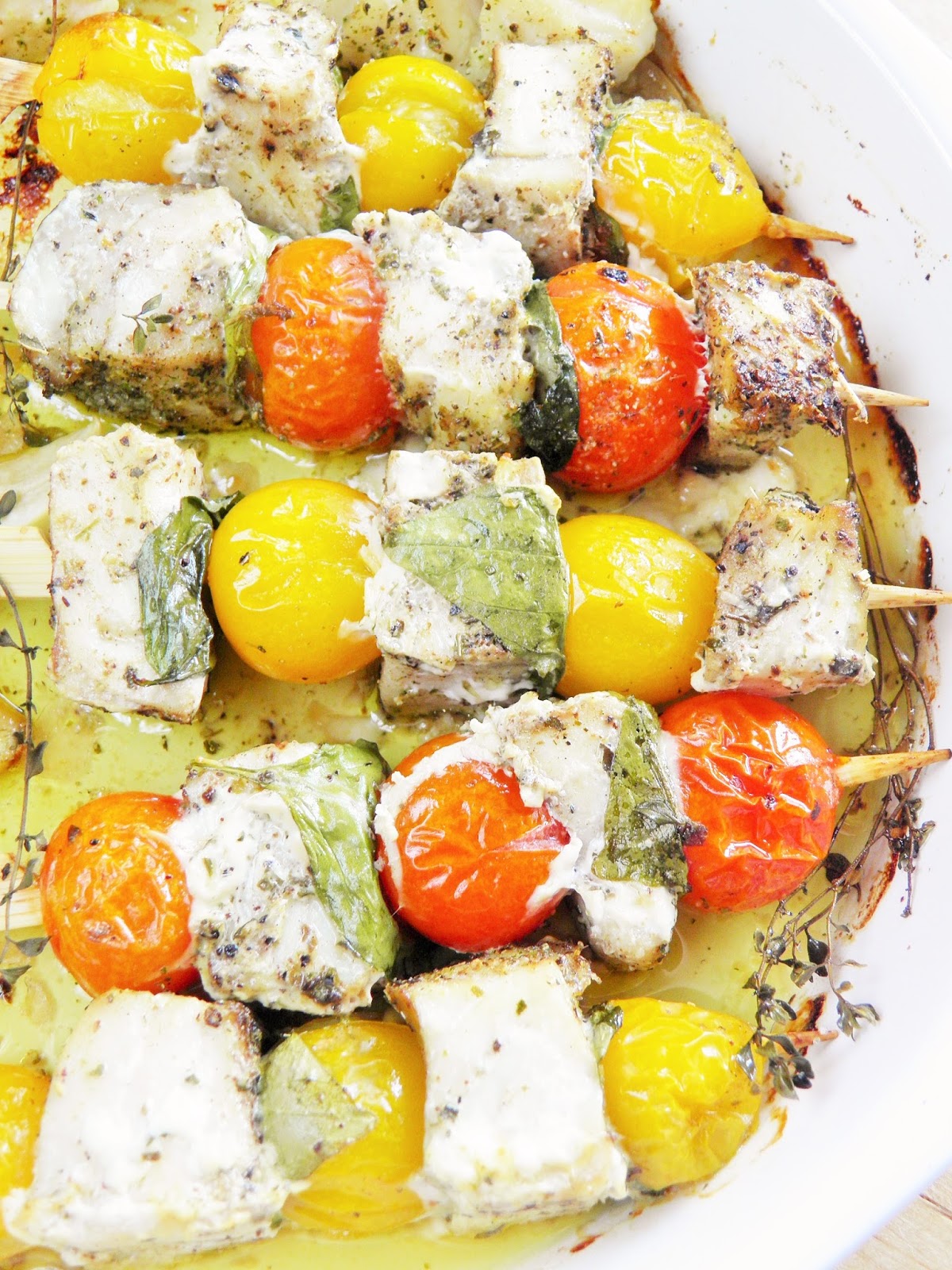 Umytą, dobrze osuszoną rybę kroję w kawałki 2 x 2 cm. Przyprawy ucieram w moździerzu, nacieram mieszanką kawałki ryby i pozostawiam ją na 15 minut w lodówce. Następnie nadziewam na przemian pomidorki, całe liście bazylii i kawałki ryby na szpadki lub patyczki, układam tak przygotowane szaszłyki w naczyniu do pieczenia (na dno wlewam kilka łyżek oliwy). Dorzucam przekrojone na pół ząbki czosnku i gałązki tymianku, piekę przez 40 minut w temperaturze 180 stopni C. W trakcie pieczenia polewam szaszłyki