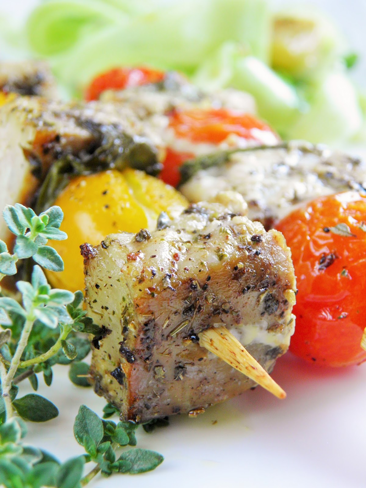 Proste i szybkie w przygotowaniu szaszłyczki dwuskładnikowe. Można je ugrillować na grillu lub na patelni grillowej.Szaszłyczki podałam z kuskusem z dodatkiem suszonych pomidorów z czosnkiem i bazylią oraz pomidorkami malinowymi z cebulką.s...