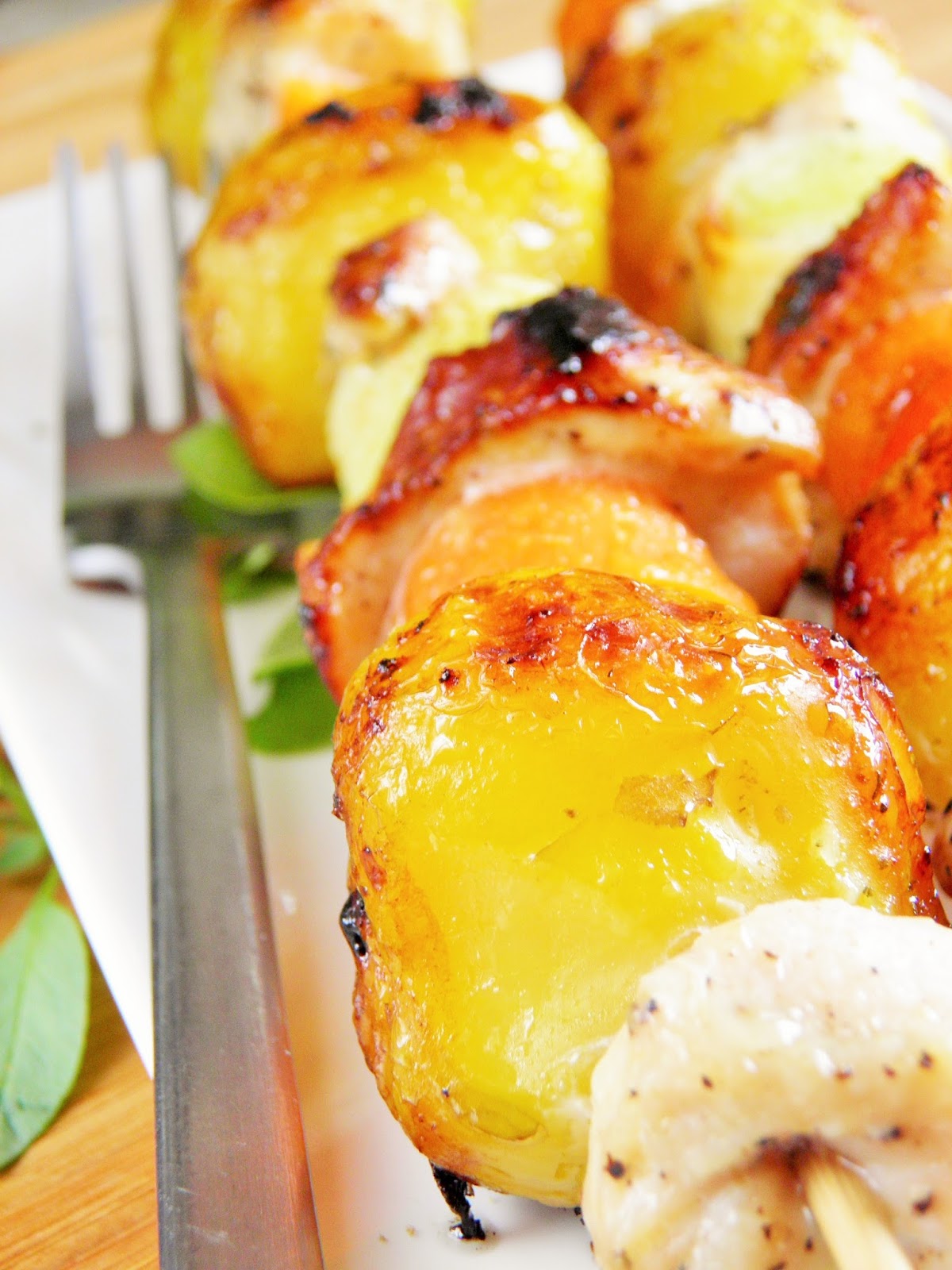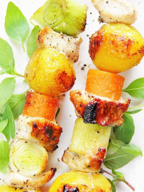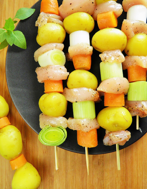 Szaszłyki z młodymi ziemniaczkami, marchewką, porem i kurczakiem
