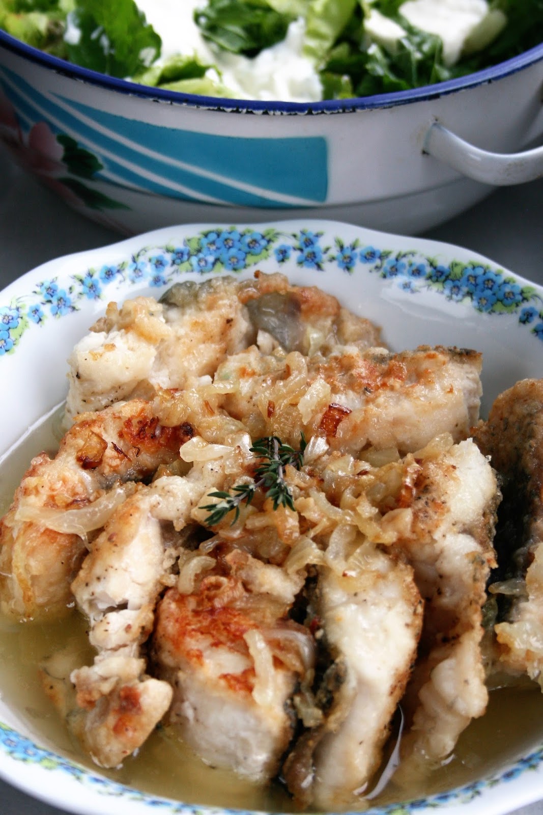Łatwy sposób na smaczną rybę - u nas to szczupak, uduszony z podsmażoną cebulką, odrobiną tymianku i czosnku.