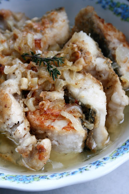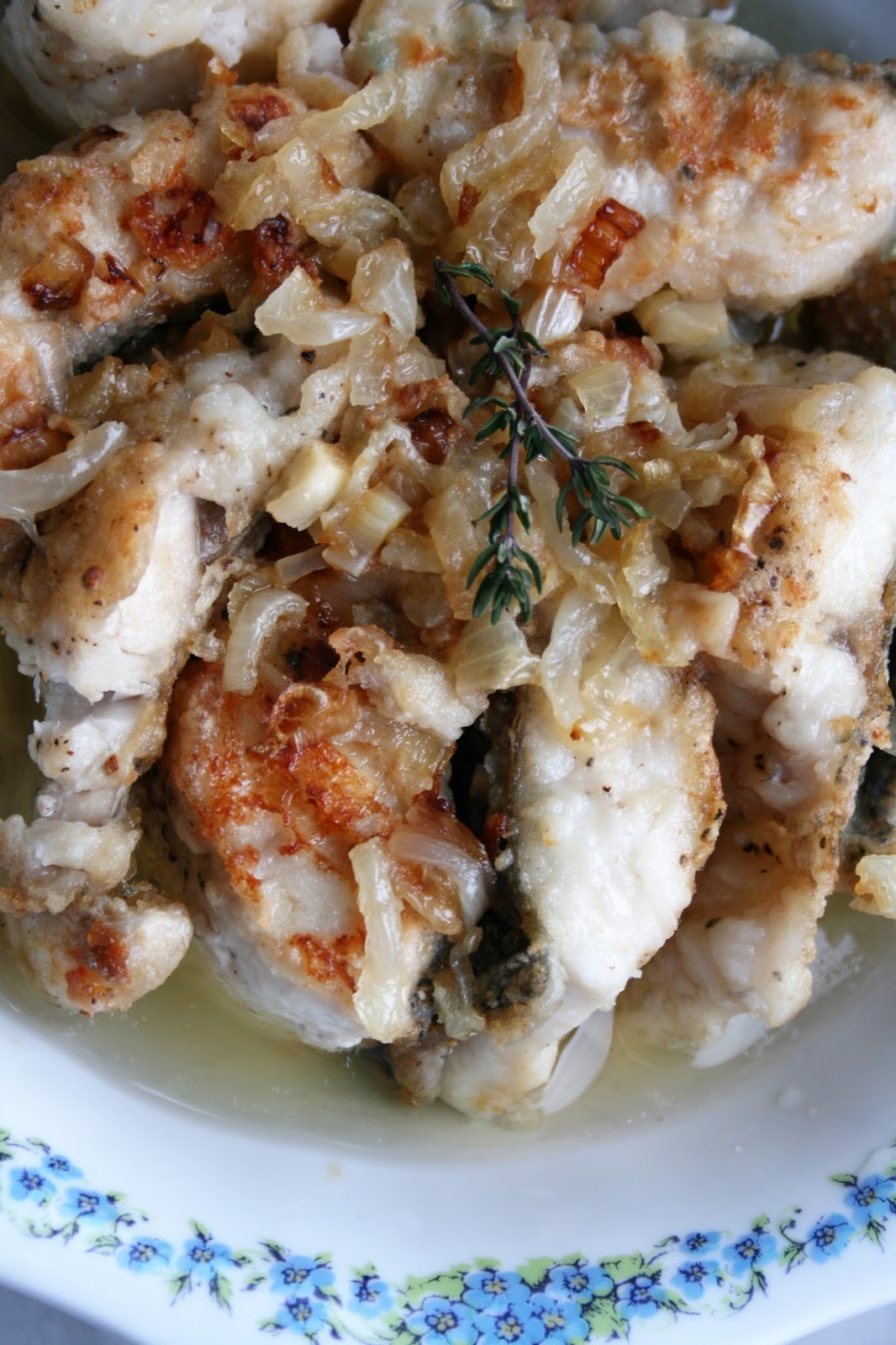 Umytą i oczyszczoną rybę kroję na kawałki, każdy oprószam pieprzem i lekko mąką, po czym smażę na rozgrzanym oleju na złoto z obu stron. Podsmażoną rybę przekładam do rondla z grubym dnem, a na gorącą patelnię po smażeniu wlewam bulion i chwilę podgrzewam. Płyn przelewam do rondla z rybą. Na oddzielnej (lub umytej) patelni, na niewielkiej ilości oleju podsmażam do zeszklenia pokrojone w piórka cebule, przekładam je do rondla. Dodaję szczyptę tymianku, posiekany ząbek czosnku i liść laurowy, oprószam też całość solą. Duszę na małym ogniu ok. 30 minut. Doprawiam do smaku solą i pieprzem.