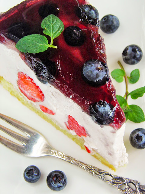 Przygotowuję galaretkę poziomkową w szklance wody, studzę ją, powinna zacząć się ścinać. Mocno schłodzoną (minimum 12 godzin w lodówce) śmietanę ubijam chwilę na średnich obrotach, po czym dodaję po trosze cukier puder, ubijam aż zgęstnieje. Nie przerywając ubijania dodaję po łyżce serek mascarpone, a na koniec powoli tężejącą galaretkę. Wykładam połowę masy na zimny biszkopt, wtykam truskawki, uzupełniam tortownicę resztą masy. Wstawiam ją na 15 minut do lodówki, a w tym czasie rozpuszczam galaretkę jagodową (wg przepisu), studzę ją. Na schłodzonej masie śmietanowej układam borówki, zalewam wszystko tężejącą galaretką jagodową. Przed pokrojeniem schładzam minimum 3 godziny.
