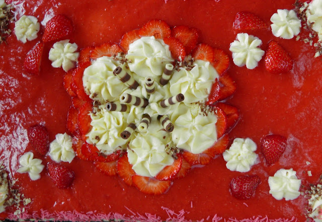 Obie osoby to panie, więc postawiłam na żywą czerwień, mocno truskawkowy smak i słodkie, czekoladowe ozdoby.
