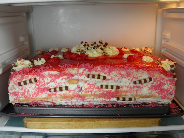 Jak to zawsze bywa z tortem, który piecze się dla kogoś - mogę sobie tylko wyobrazić, jak wygląda w środku ;) W każdym razie jeszcze cieszy moje oko z mojej lodówce: