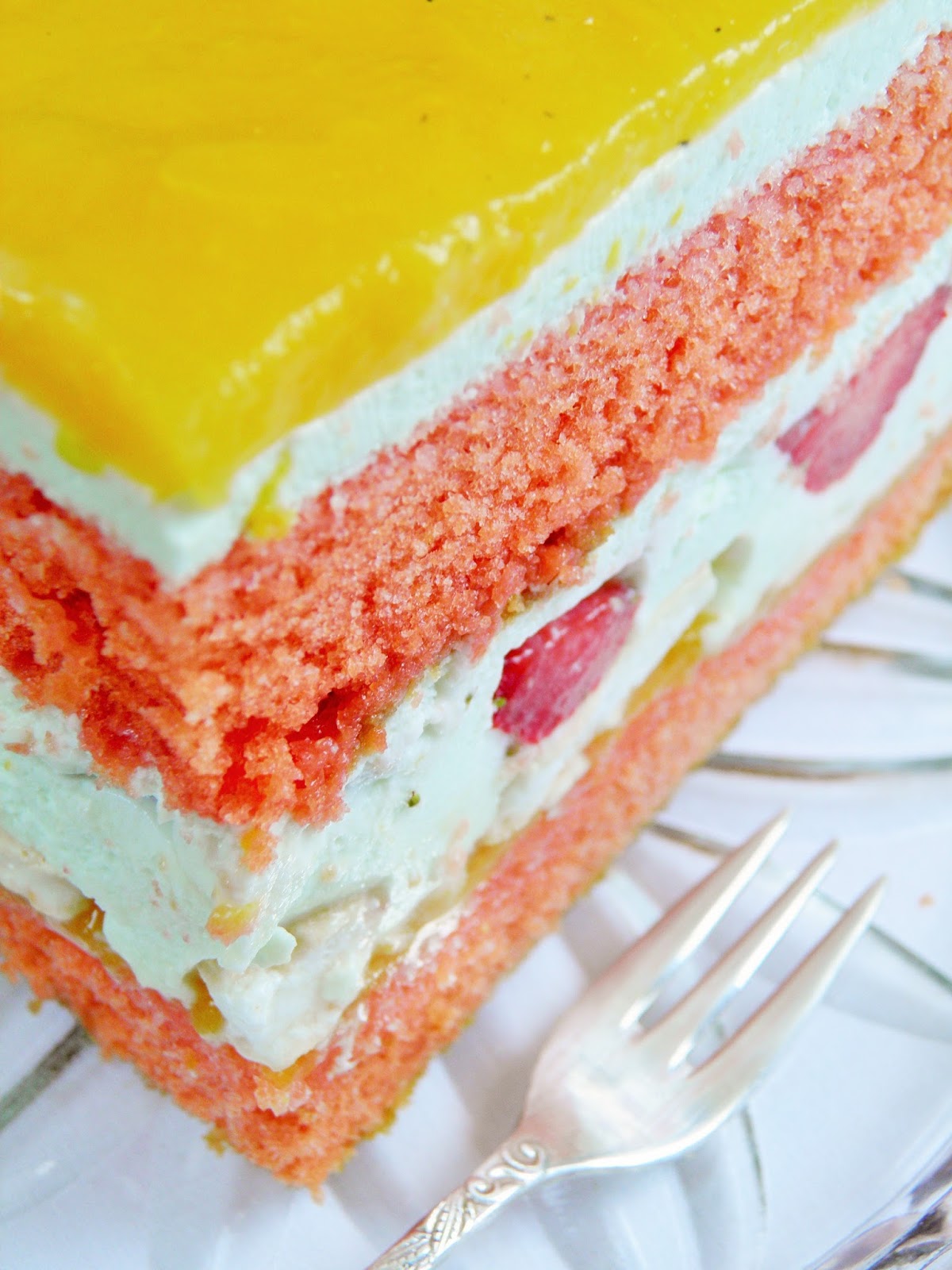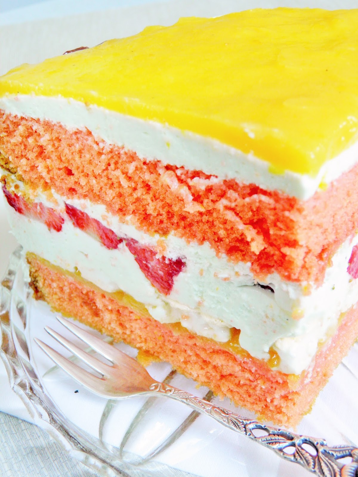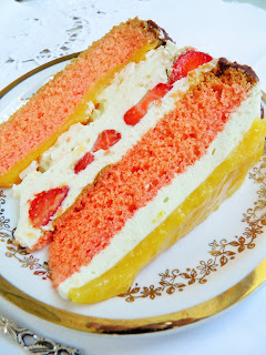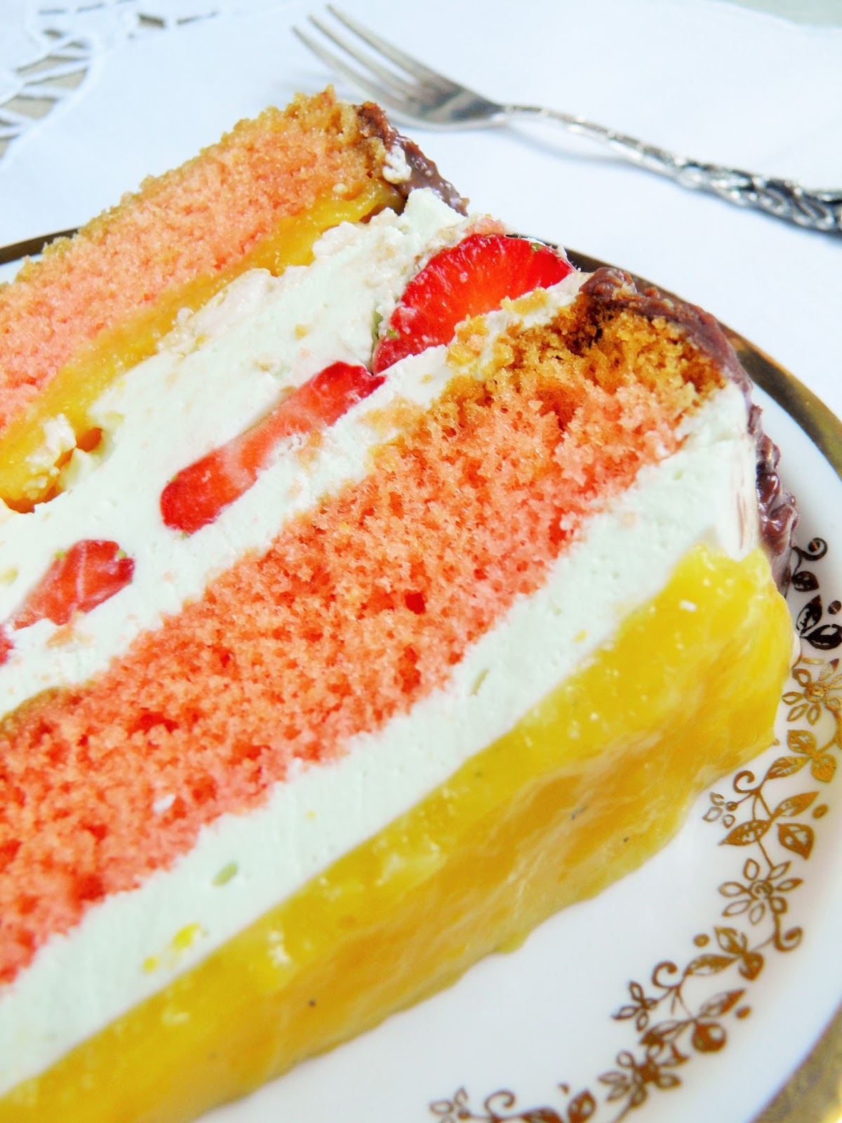 Tort z masą śmietanową, truskawkami i musem brzoskwiniowym.