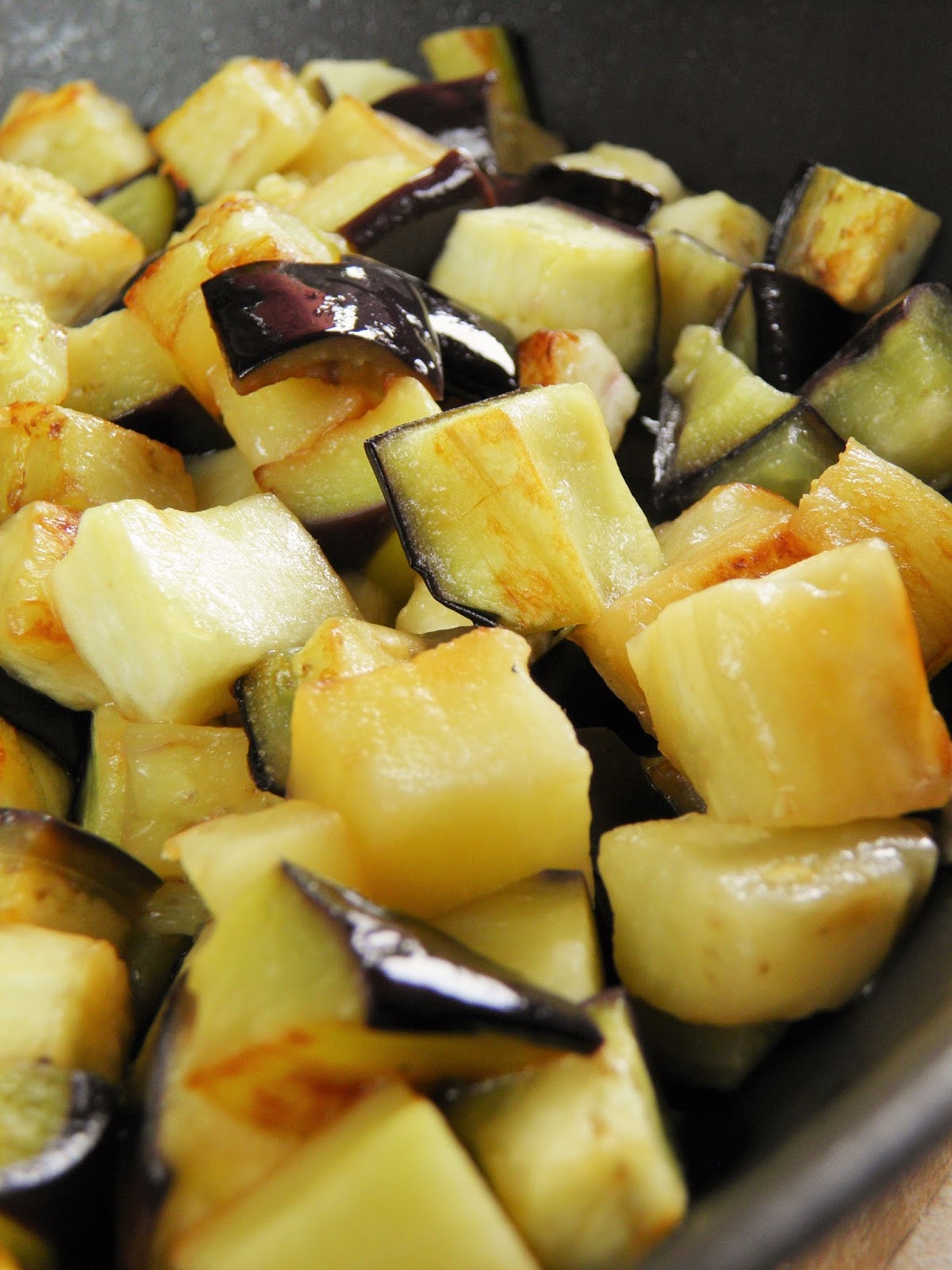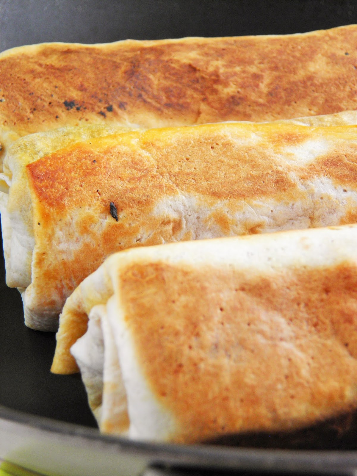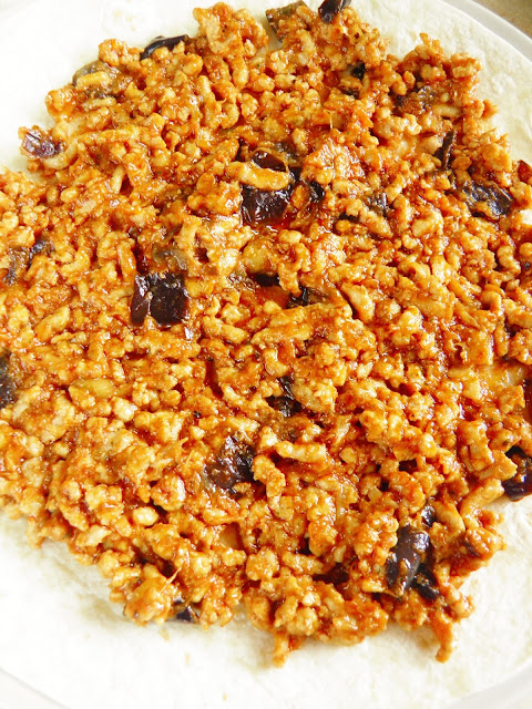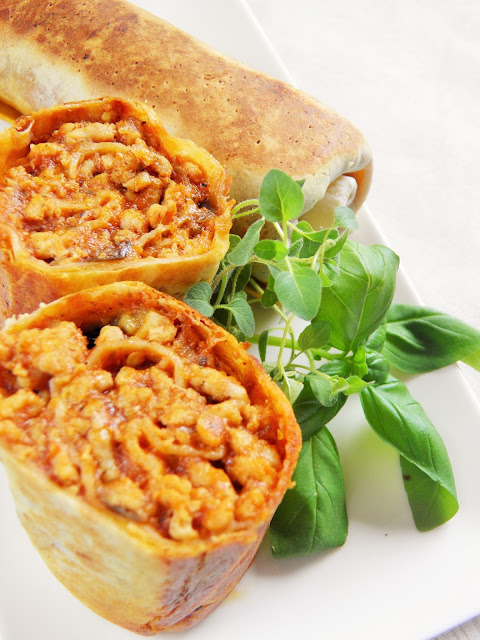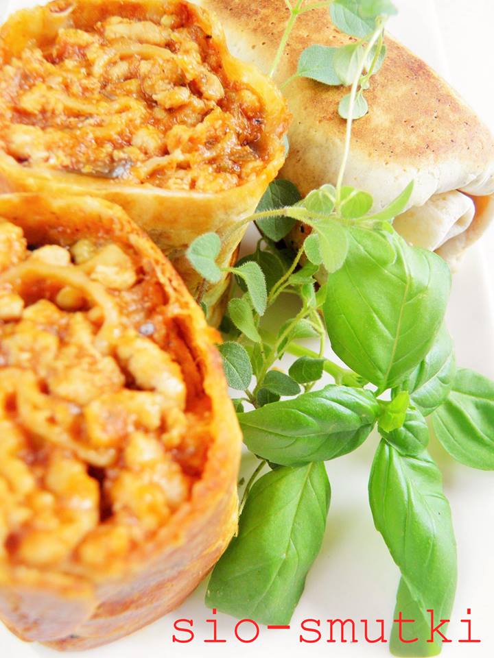 Składniki na 4 porcje:4 duże tortille400 g. mięsa mielonego z szynki wieprzowej1 średni bakłażan3 ząbki czosnkuduża szczypta cynamonuduża szczypta curryduża szczypta cukru (najlepiej ciemnego)0,5 łyżeczki majeranku1 płaska łyżeczka słodkiej, mielonej paprykido 0,5 szklanki pulpy pomidorowejolejPrzygotowanie: Bakłażana kroję w ok. 1 cm kostkę, przekładam na patelnię z rozgrzanymi 5 łyżkami oleju, lekko solę. Przykrywam pokrywką i mieszając smażę do 10 minut - na średnim ogniu. Na początku bakłażan będzie suchy, ale wypuści sok. Zdejmuję bakłażana z patelni, dolewam na nią 2 łyżki oleju i wrzucam posiekany czosnek. Smażę ok. minuty, uważając by się nie przypalił, a następnie przekładam na patelnię mięso. Solę je odrobinę i rozdrabniając smażę ok. 5 minut, aż przestanie być surowe, tym razem bez pokrywki. Dodaję cynamon, curry, paprykę, majeranek i podsmażonego bakłażana, przykrywam i smażę wszystko kolejne 5-8 minut. Na koniec dolewam pulpę pomidorową, doprawiam do smaku solą i pieprzem. Tak przygotowany farsz dzielę na 4 porcje i każdą wykładam na okrągłą tortillę. Zwijam ją podobnie jak gołąbki: najpierw dwa boki składam do środka, a potem zwijam tortillę w rulon. Rulony układam na suchej patelni, przykrywam i na małym ogniu smażę po kilka minut z każdej strony, by ciasto się zarumieniło. Podaję na gorąco, z sosem czosnkowym i świeżym ogórkiem.Przepis autorski.