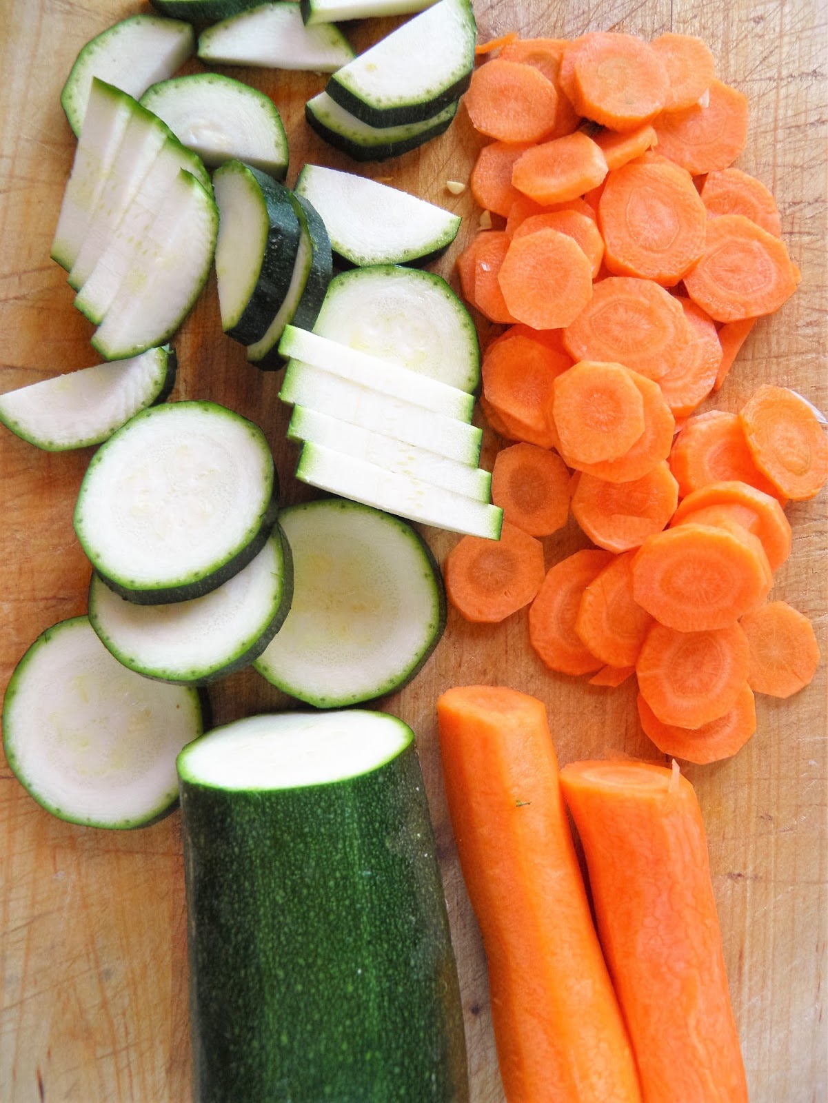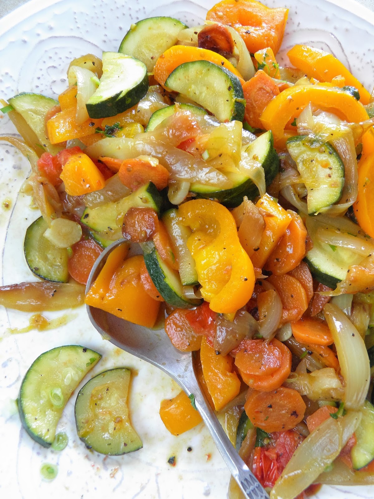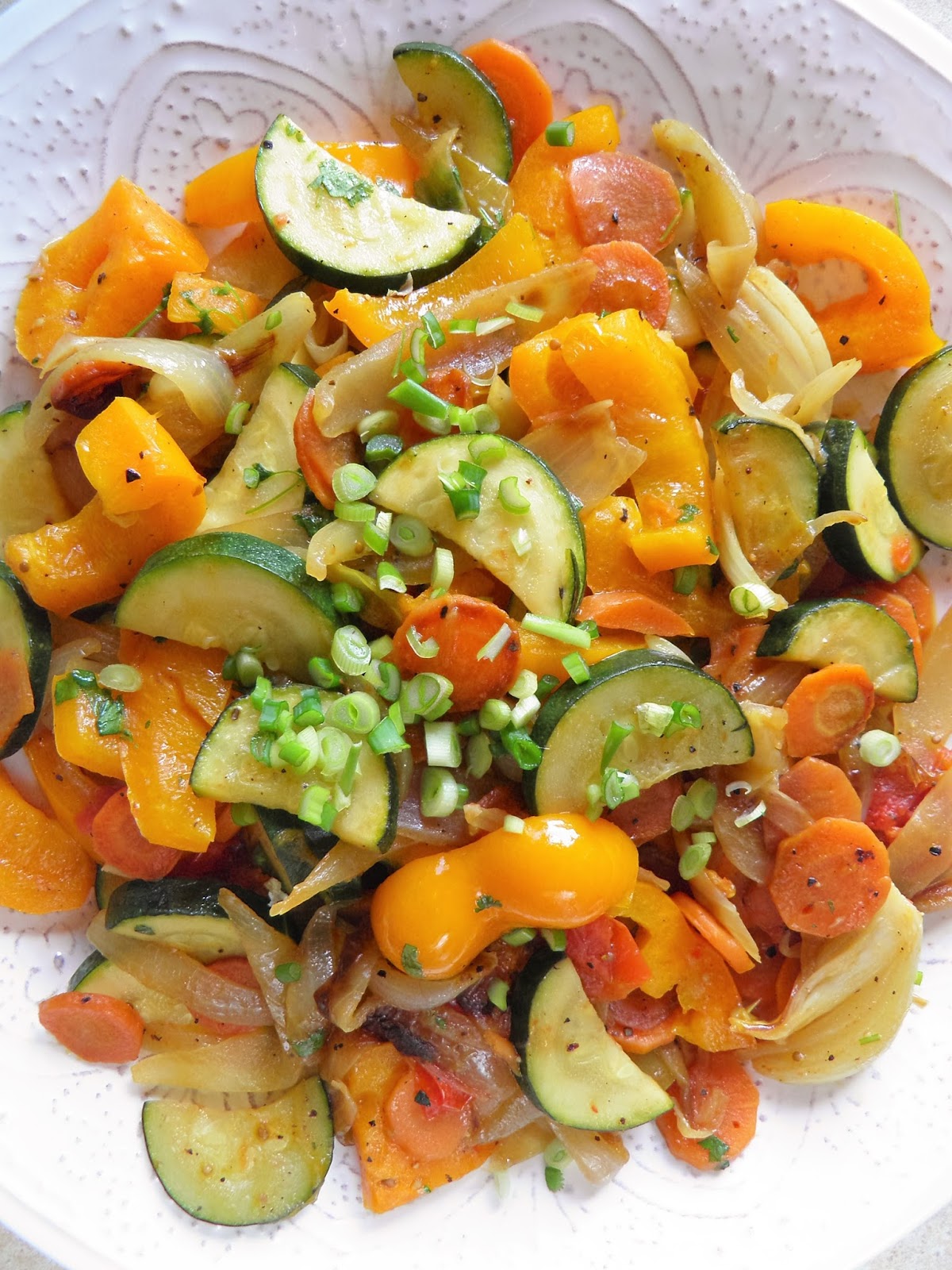Obrane marchewki kroję w cienkie plasterki, umyte i osuszone cukinie w półplasterki. Cebule siekam w piórka, papryki w paski, pomidorki na pół. Rozgrzewam olej na głębokiej patelni i wrzucam marchewkę, podsmażam ją 2 minuty, mieszając. Dorzucam cebule, lekko solę i przykrywam patelnie. Smażę ok. 5 minut - cebula ma się zeszklić i lekko zarumienić. Wtedy na patelnię wrzucam pozostałe warzywa, łącznie z posiekanym czosnkiem, wstępnie doprawiam solą i pieprzem. Przykrywam i smażę mieszając, ok. 15 minut. Na koniec dodaję posiekane zioła, doprawiam do smaku solą, pieprzem, curry i kuminem. Warzywa podaję gorące, posypane szczypiorkiem, z bagietką.