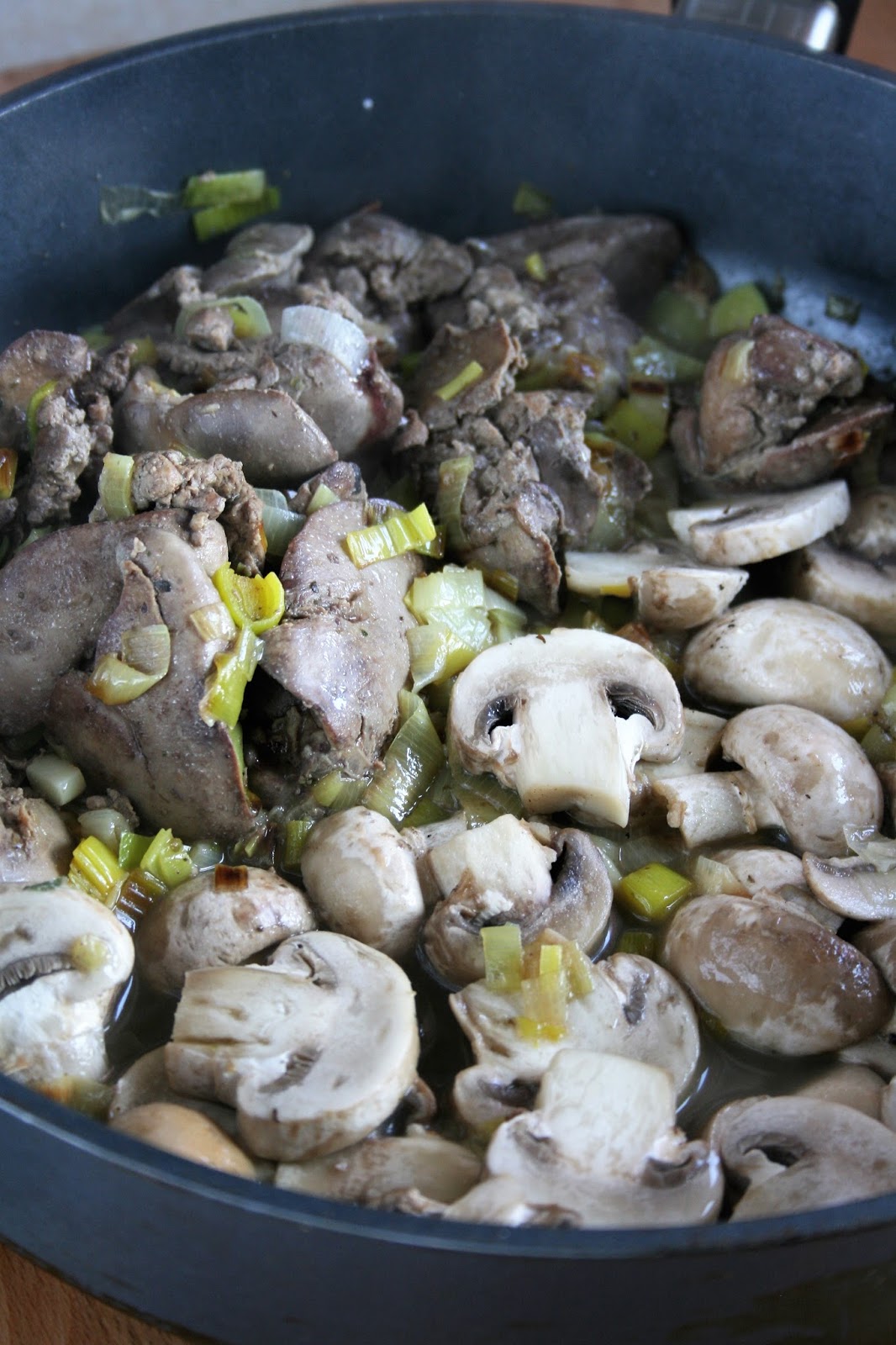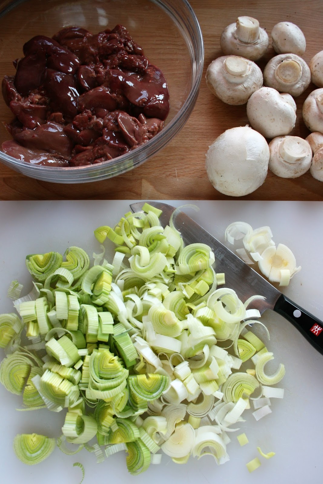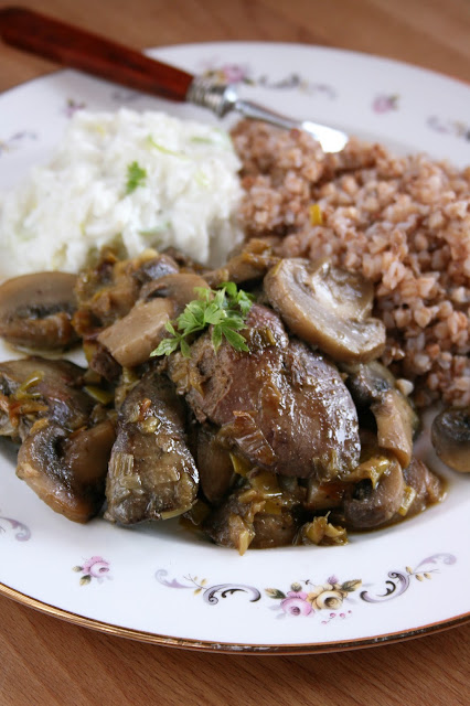 Wątróbka z kurczaka duszona z porem i pieczarkami