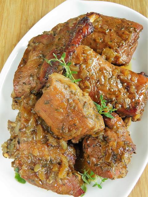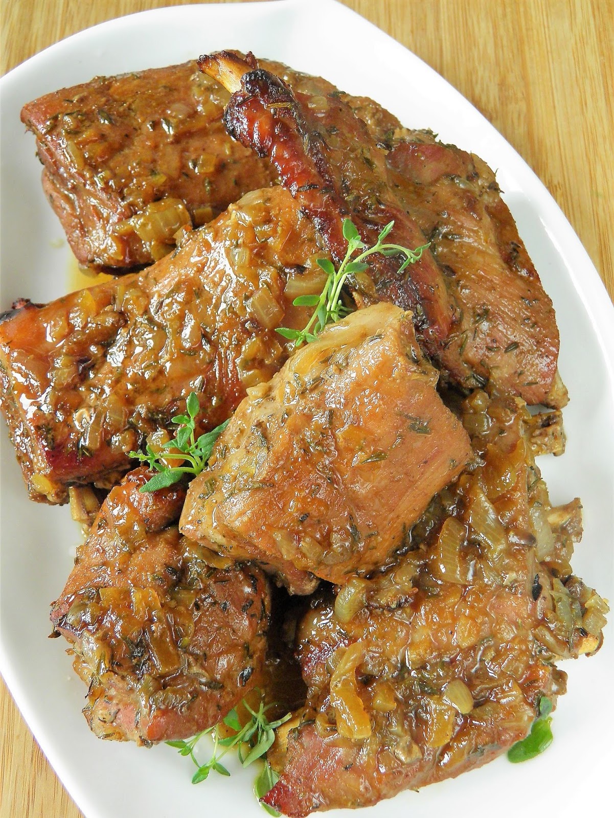 Umyte i osuszone mięso dzielę na porcje. Cebule siekam bardzo drobno, łączę je z miodem, solą, pieprzem, sosem sojowym, tymiankiem i balsamico. Powstałą pastą dokładnie nacieram żeberka i odstawiam je na godzinę do lodówki. Następnie przekładam je do worka do pieczenia, ściśle związuję, nakłuwam worek w kilku miejscach. Piekę przez godzinę w temperaturze 200 stopni C, po czym delikatnie nacinam worek u góry i piekę jeszcze 10-15 minut. Podaję z ugotowanymi ziemniakami i surówką.