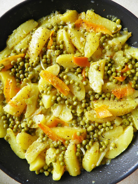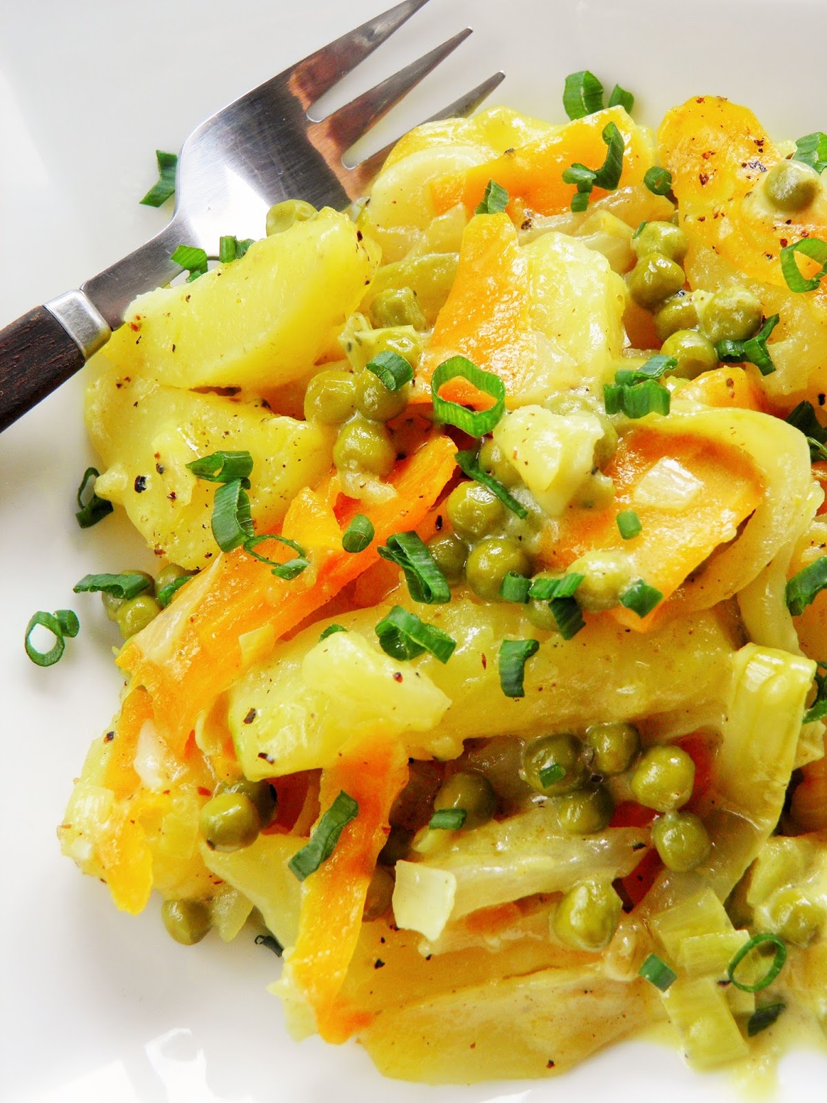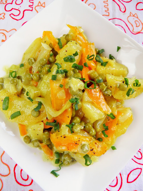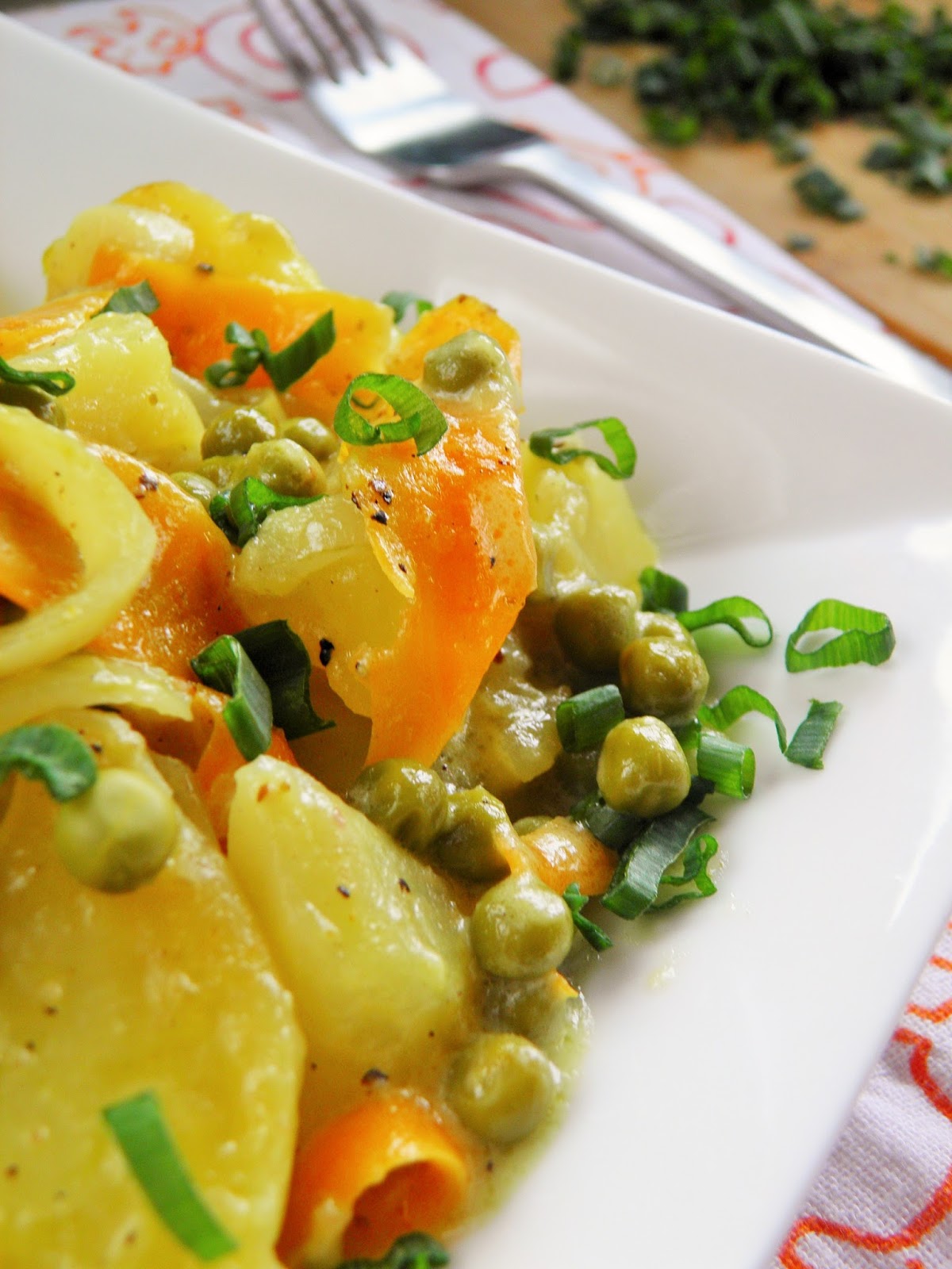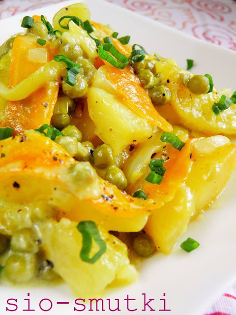 Miałam dziś tak mało czasu i jakoś wyjątkowo mało chęci na gotowanie, bo przeziębienie chodzi za mną od wczoraj - że już, już gotowa byłam coś zamówić na obiad. Co prawda kupiłam kaczkę, ale dziś na nią nie miałam siły. Zwyciężył jednak mój zdrowy rozsądek, bo warzyw jak zwykle nie brakowało - upitrasiłam przepyszną potrawkę z ziemniaków, marchewki, cebulki i pora, wszystko z zielonym groszkiem, słodką śmietanką, doprawione curry i czosnkiem... Wszystkie zamawiane obiady niech się schowają - takie to było smaczne ;)