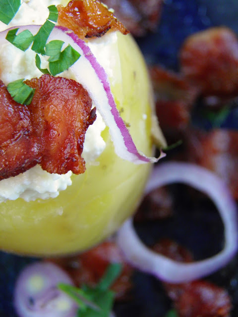 Ziemniaki gotuję do miękkości, w mundurkach. Twaróg rozdrabniam i mieszam ze śmietaną do pożądanej konsystencji, dodaję drobno posiekaną cebulę, doprawiam solą i pieprzem. Boczek kroję w kawałki i smażę do zrumienienia. Ziemniaki podaję na gorąco, z porcją sera, rumianym boczkiem i plastrami czerwonej cebuli, posypane natką pietruszki.