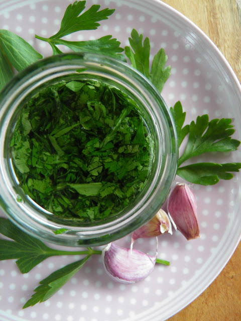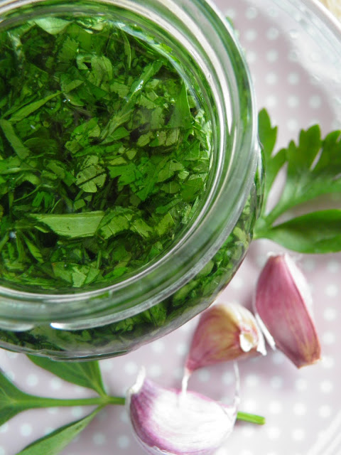 Zioła (mniej więcej w równej ilości) dokładnie myję i osuszam, a potem drobno siekam - można nawet pokusić się o ich zblendowanie. Dodaję do nich trochę soli (ta ma za zadanie przedłużyć ich trwałość; pamiętajmy potem jednak o jej obecności przy doprawianiu potrawy), przeciśnięty przez praskę czosnek i tyle oleju, by powstałą pasta. Przekładam ją do słoiczka, ubijam łyżeczką i zalewam taką ilością oleju. by utworzył warstwę na górze. Przechowuję w lodówce.