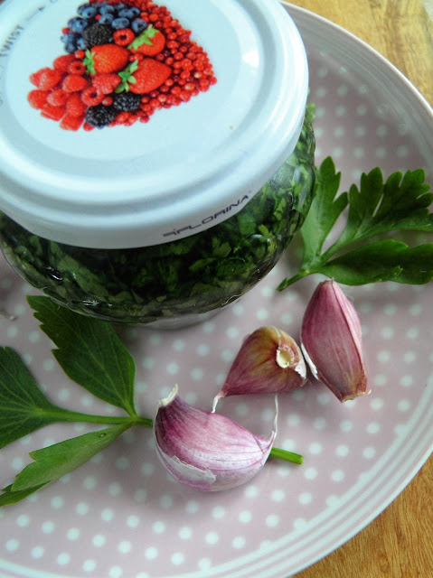 Każda gospodyni ma swoje patenty na ułatwienie sobie życia, jestem o tym przekonana. Wymyślamy je same, albo czerpiemy od starszych - tak czy siak po kilku latach samodzielnego prowadzenia domu zbiera się co najmniej kilka sposobów, żeby zrobić coś szybciej, łatwiej i skuteczniej. Tak samo jest w kuchni. Jednym z moich sposobów oszczędzenia czasu jest taki słoiczek z zieleniną.