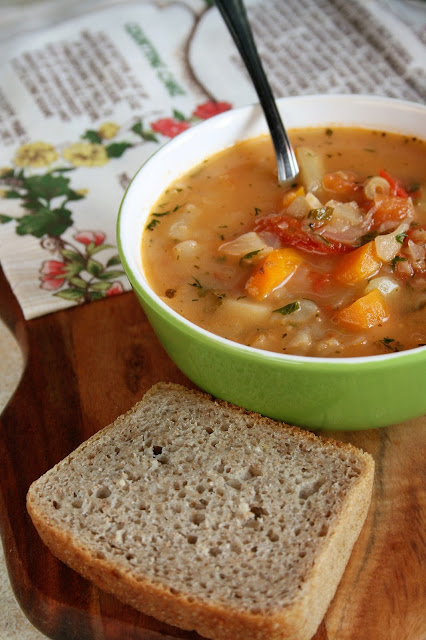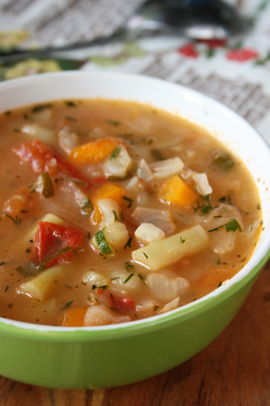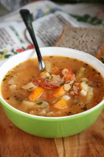 Wspaniała, esencjonalna zupa pełna pysznych warzyw - z marchewką, pietruszka, kapustą, selerem i czosnkiem, lekko kwaśna za sprawą pomidora.