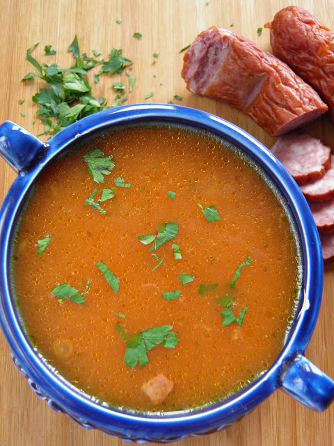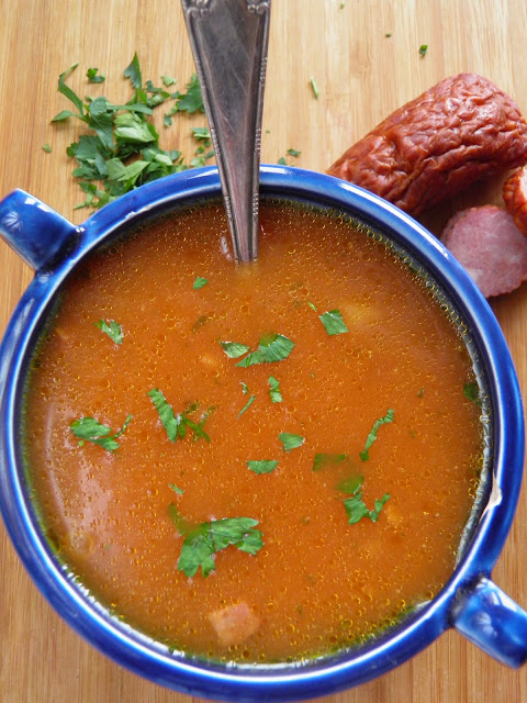 , idealna na tę porę roku. Jest bardzo sycąca i pożywna, świetnie doprawiona. Ja wykorzystałam do niej dodatkowo bardzo aromatyczny sos z pieczonej łopatki, którą ostatnio robiłam do kanapek, i dorzuciłam jeszcze od siebie posiekaną kiełbaskę.