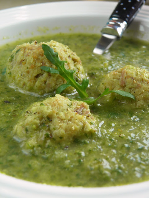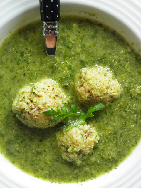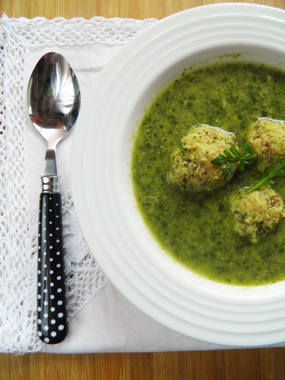 Rano tak sypało, że nie miałam ochoty wystawiać nosa z domu. Co prawda lodówka prawie pusta, ale dałam radę - była rukola, był zamrożony brokuł i kawałek mięsa. Zrobiłam więc piękną, zieloną zupę :) Niewątpliwie tanią i pożywną, bo z mięsnymi pulpecika...