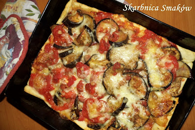 Na cieście rozłożyć bakłażana wymieszanego ze świeżymi pomidorami (dobrze jest tę masę warzywną odcisnąć z nadmiaru soku, jeśli farsz będzie zbyt wilgotny, ciasto nam nie wyrośnie i będzie się z trudem piekło).