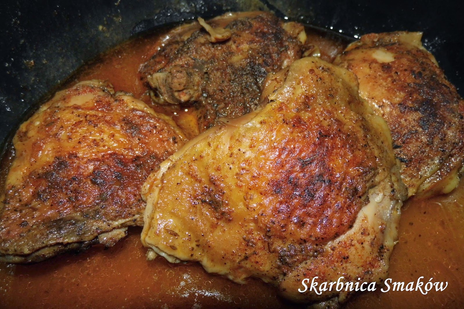 Wykonanie: Podudzia myjemy, osuszamy i doprawiamy przyprawami, należy tylko nie przesadzić z majerankiem, ponieważ potrawa może nabrać gorzkiego posmaku. Natarte przyprawami mięso odstawiamy do lodówki na jakiś czas, aby przeszło aromatami (możemy mięso doprawić poprzedniego dnia i zostawić je na całą noc w lodówce).
