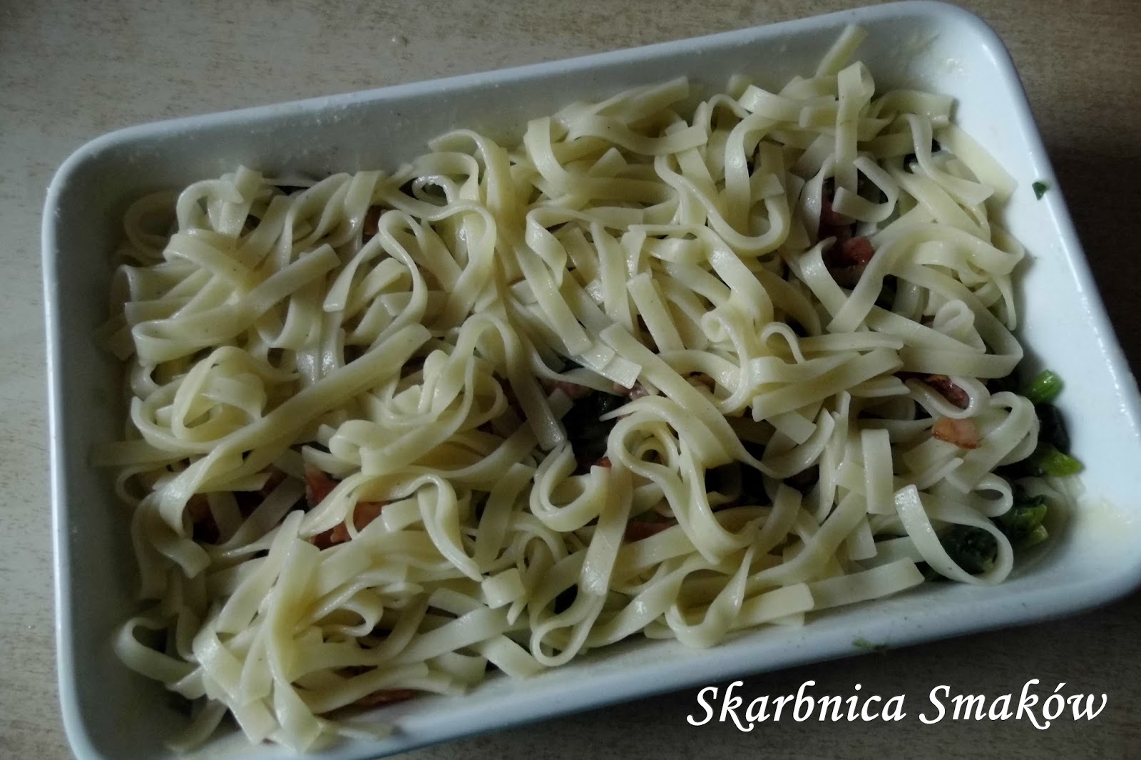 Foremkę wysmarowałam klarowanym masłem, kładąc na dno połowę ugotowanego makaronu.